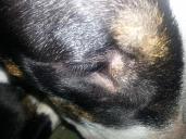• Brutus chews his butt fur at the base of his tail on both buttocks and is now after his sides I used to use chlorohexiderm on my pitx and it is seeming to work for him as well along with allergy pills at 35mg 2bid I have noticed crusting on his eye??? Anyone ever seen this??
