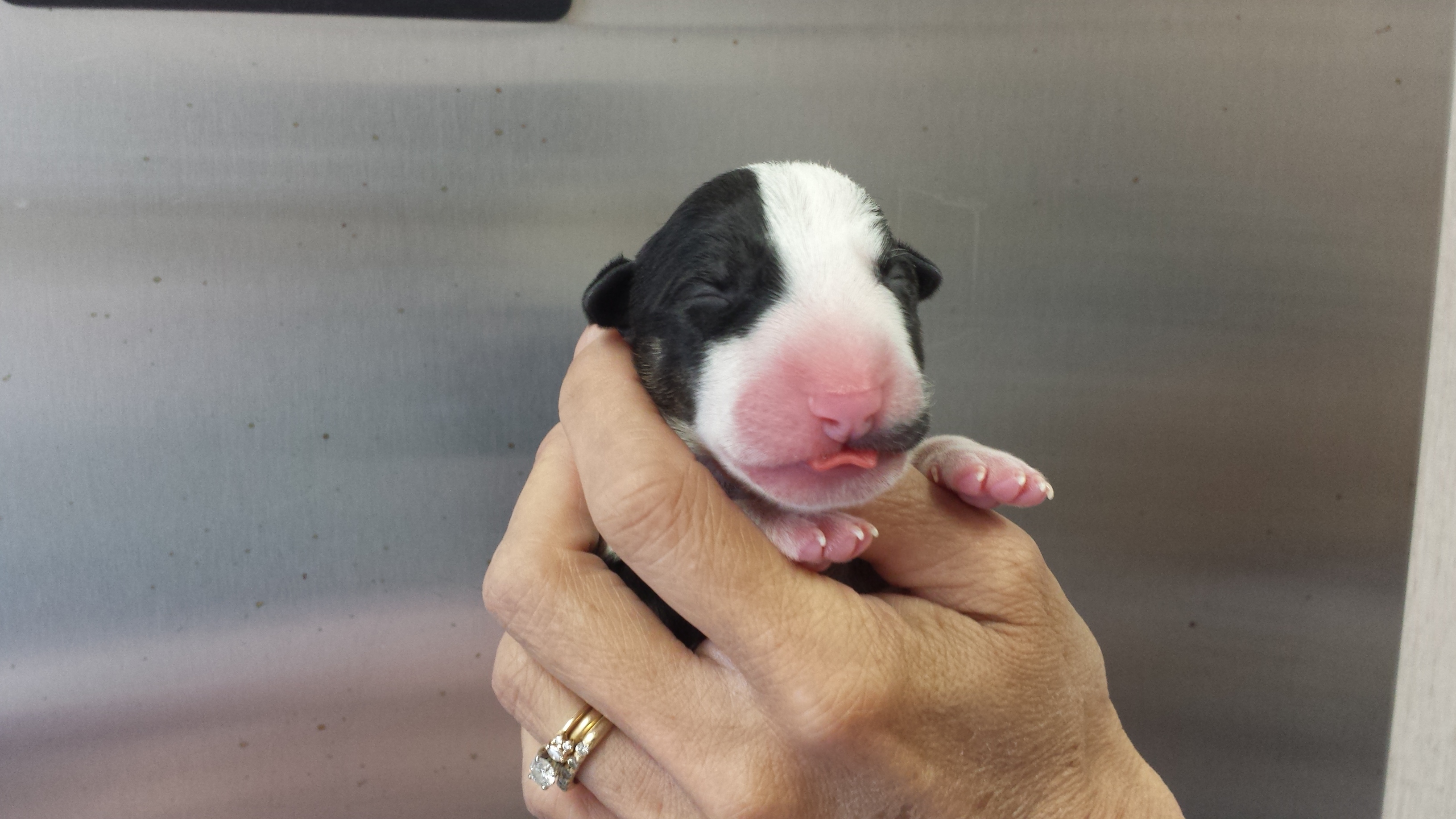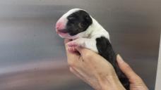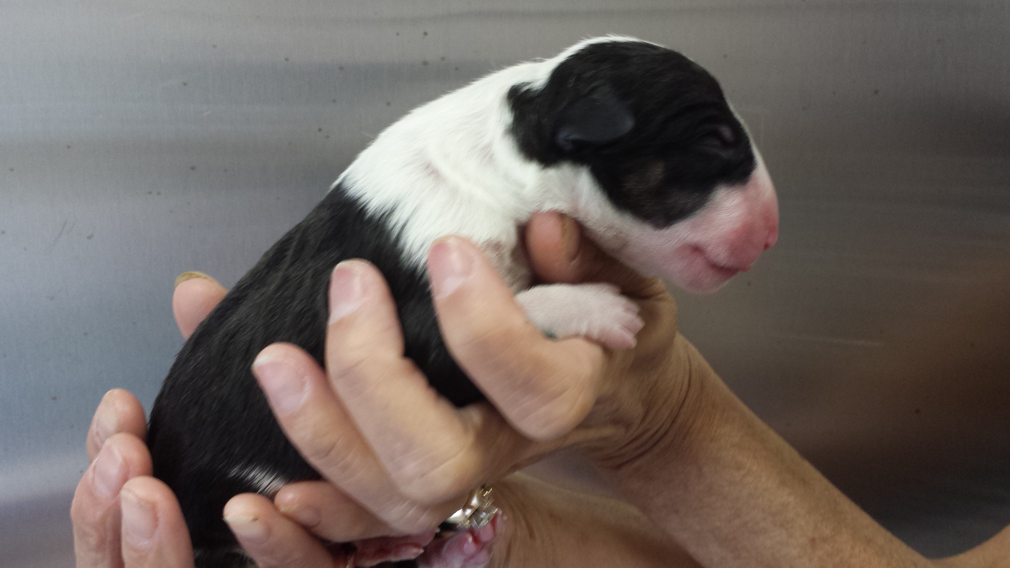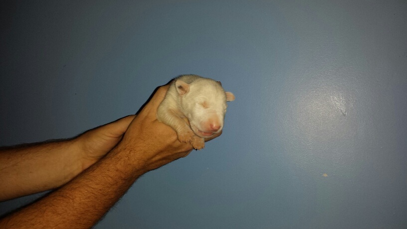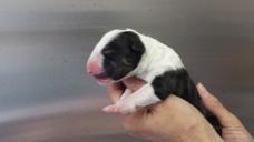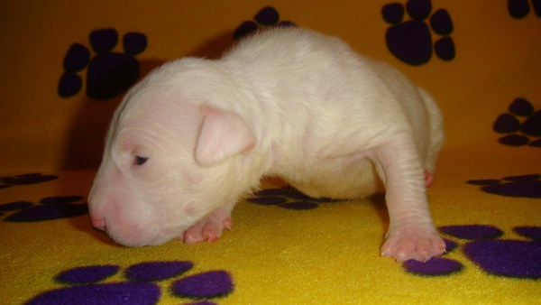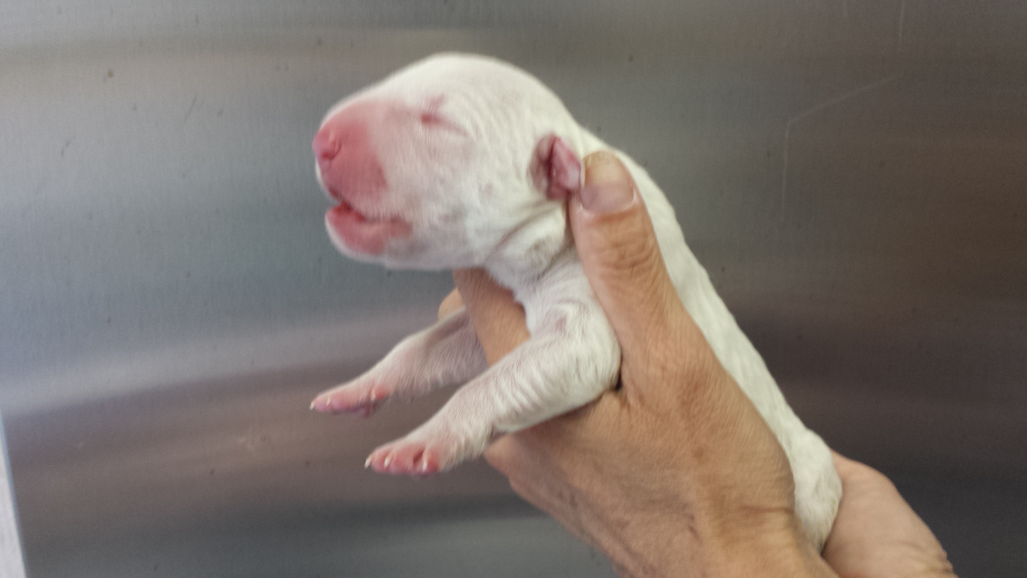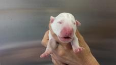 For those that don't know, Atiba has been patiently waiting to get a Bull Terrier for many months. He had hopes on a couple Brindle males from a previous litter but due to his placement on our waiting list he was not afforded the opportunity to claim one. However, as his name moved up on the list recent puppy picks have become easier for him. The puppy that he has now claimed was wanted by 3 others. He was born yesterday and weighed in at 15.8 ounces. Just shy of one solid pound. He's a solid white monster with a big gorgeous head.