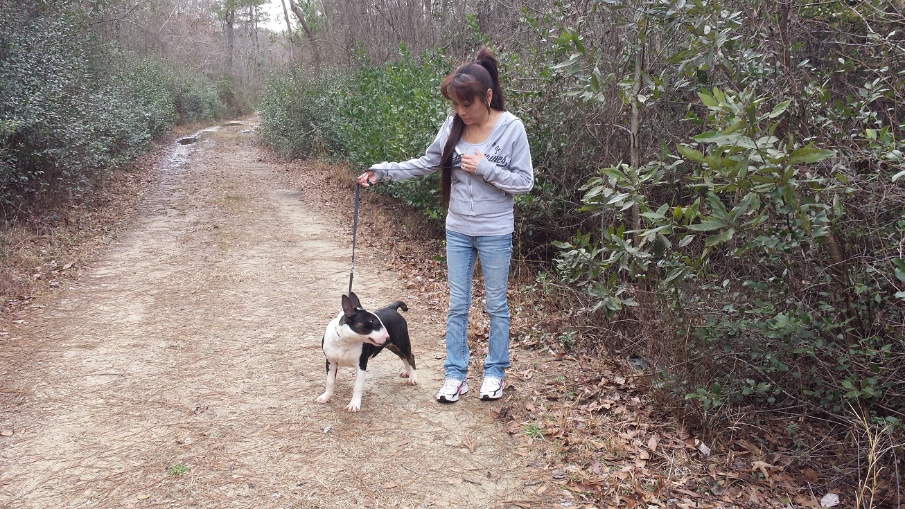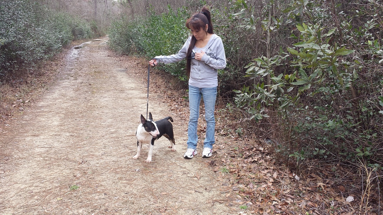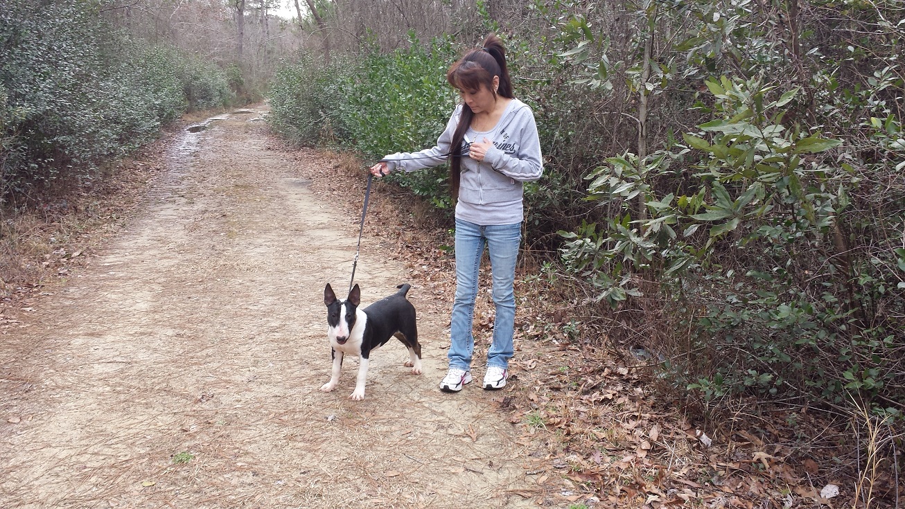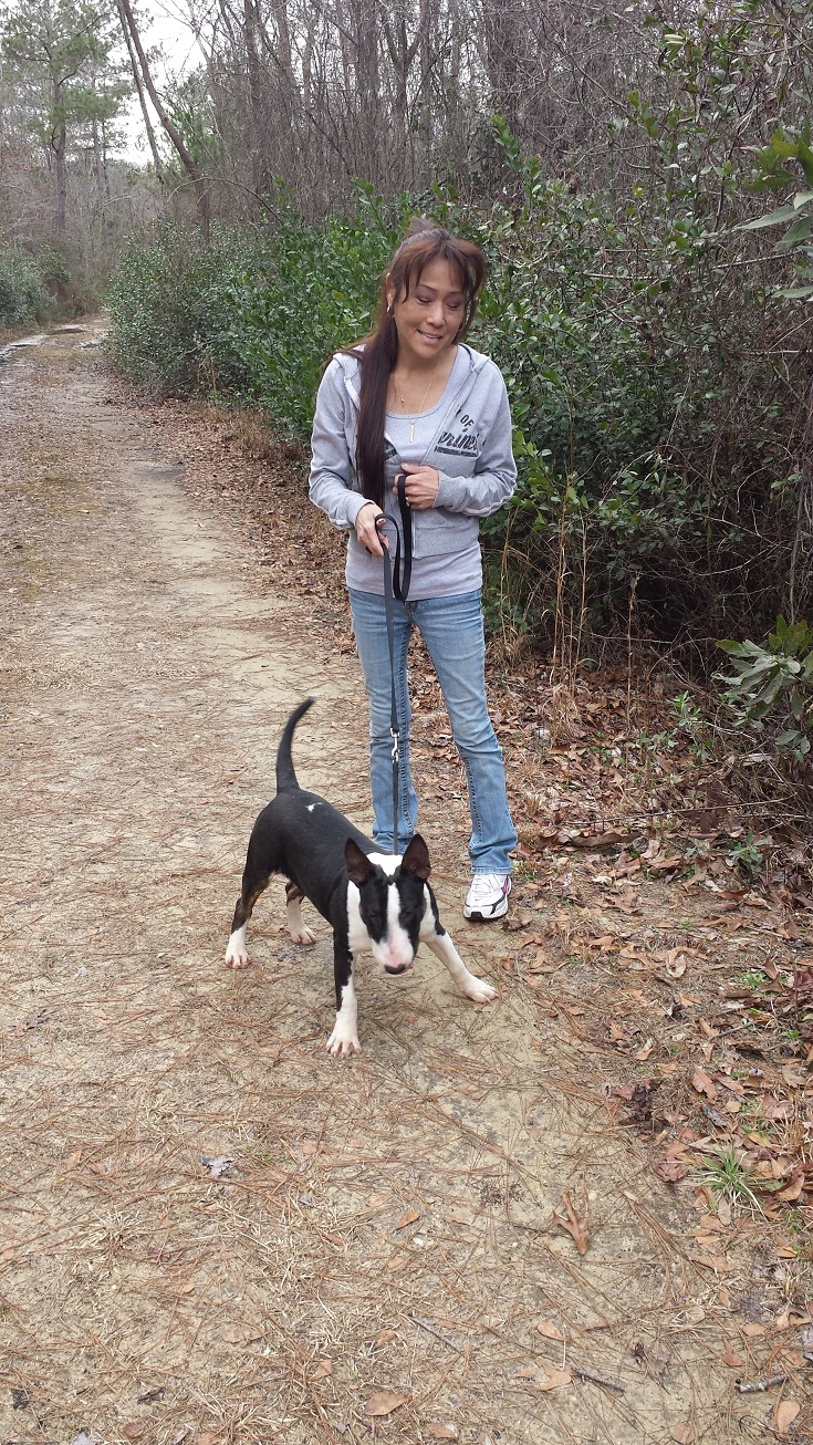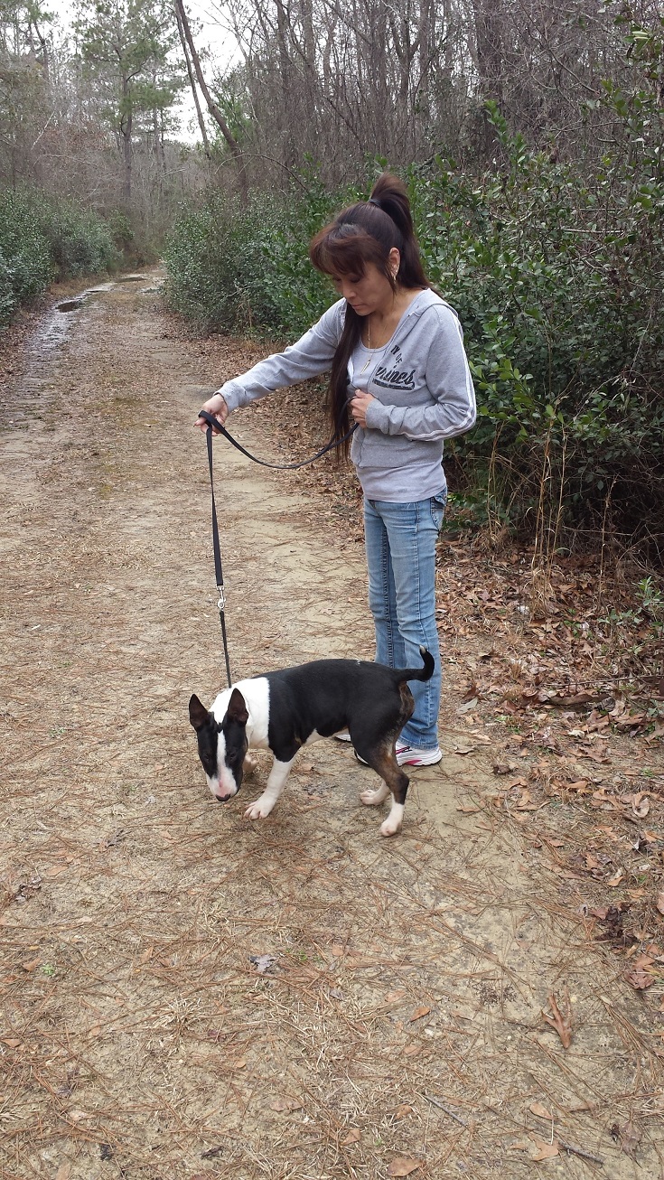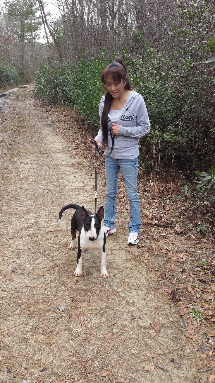 You couldn't ask for a more gorgeous North Carolina day to take a walk with a Bull Terrier. Today Julie and I decided to take Nitress on a walk in order to get her used to being on a lead. She loves walks and did outstanding. I can't wait to show her! She's a big ham and loves showing off. She loves going out for a walk in the backyard.