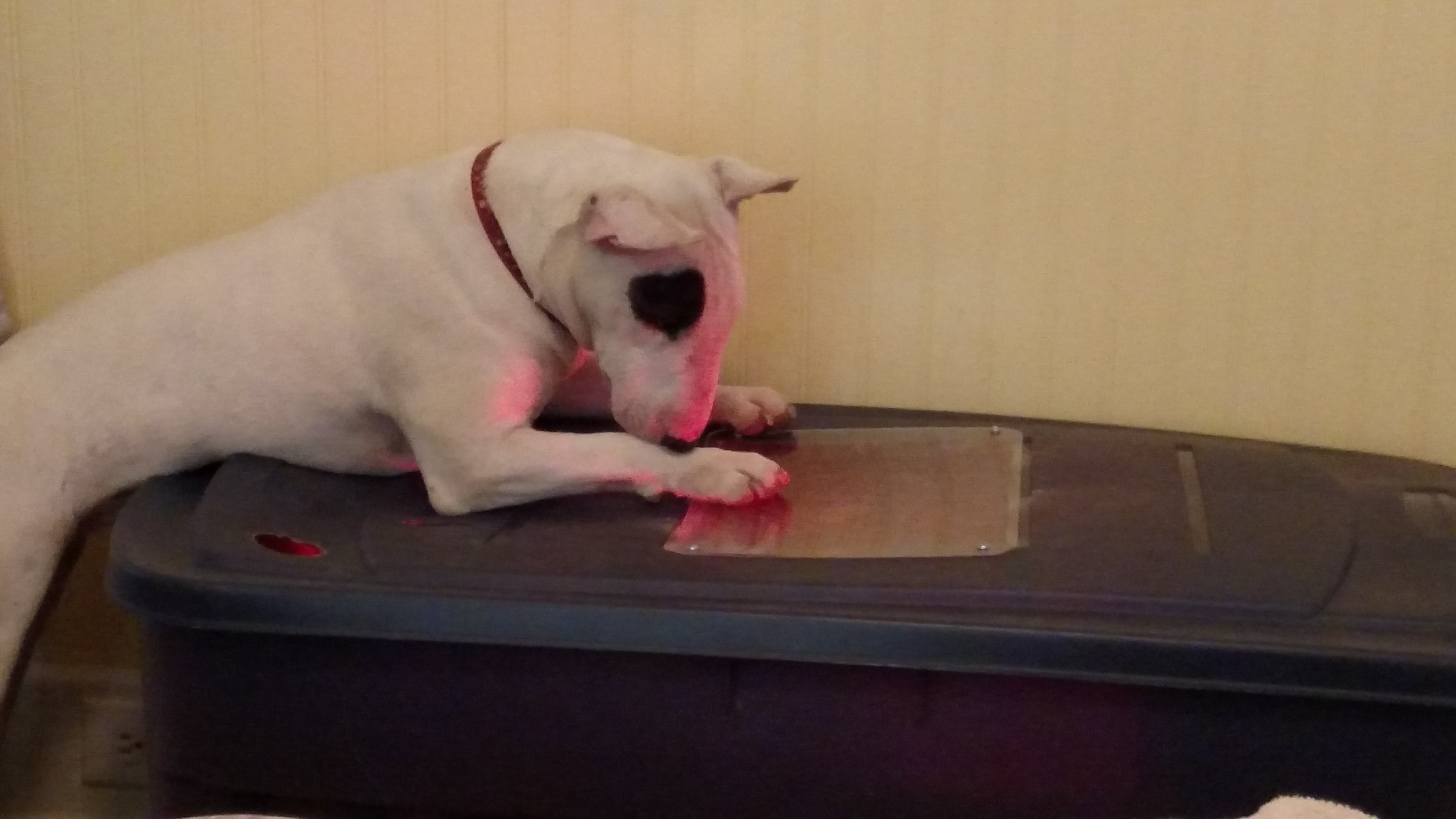 • I wanted to give you an update on my Wilma. She will be 2 years old in May and is a totally different dog. She has become a wonderful, kind, gentle dog. she no longer does the growling on the bed like she used to do. she has not attacked any other dogs for months now. I guess she just needed to grow up. Here is a picture of her with her baby chickens. she loves any baby creature. the second picture is of her looking in the baby chicken brooder