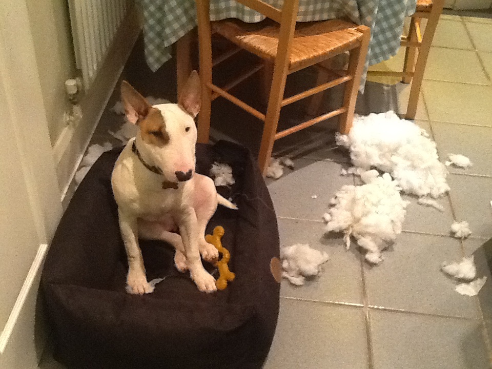 Oh my goodness, Leslie's right, the cat definitely did it, or it blew up on it's own is very likely, too. There's no way that precious pup would make that mess. She's so cute!