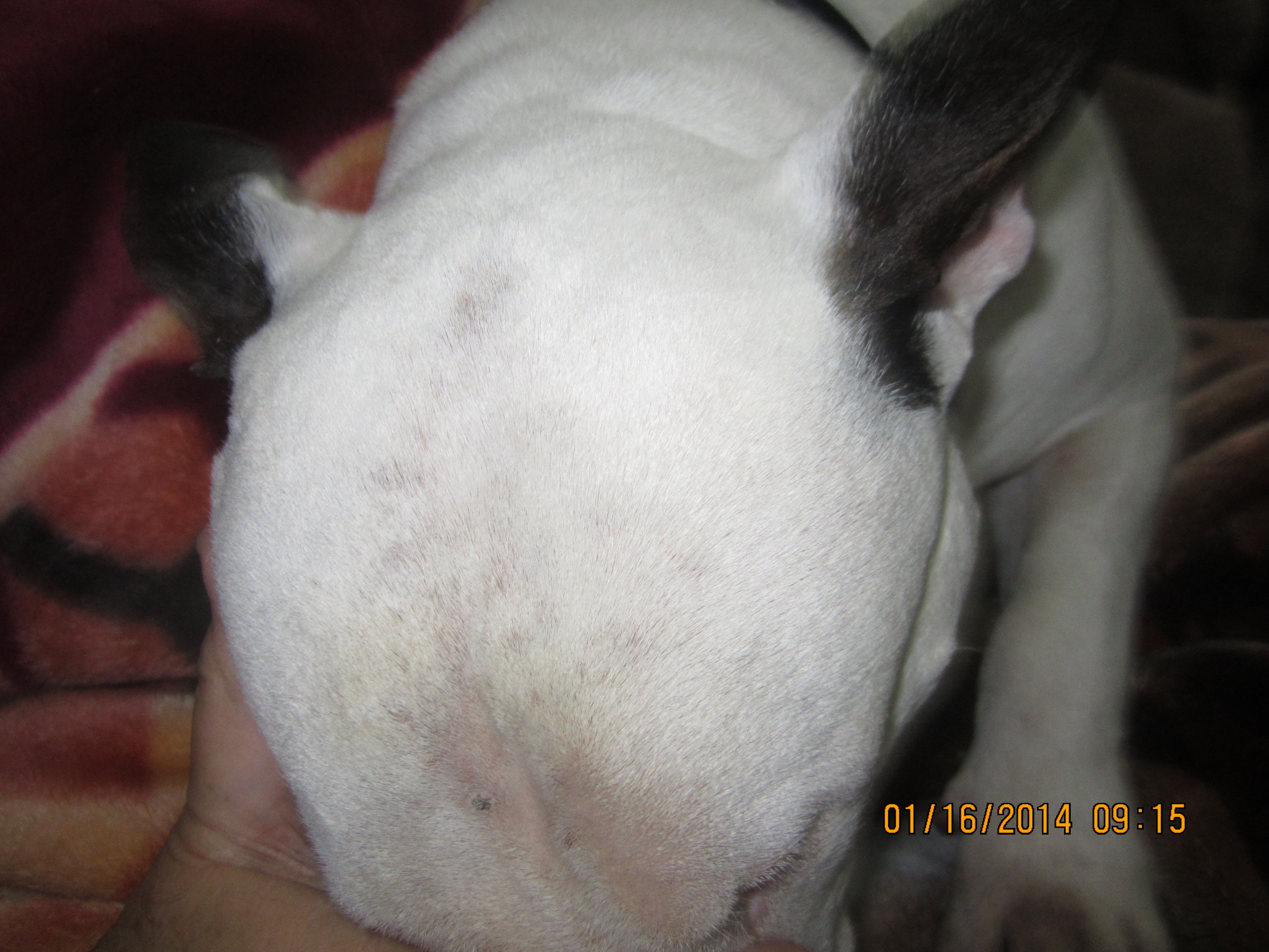 The thinning on the center of the head is fairly common in this breed especially when their immune system is working overtime. I've mentioned a few times in the past that Bull Terriers have a tendency to get a small bald spot (usually scaly and hard) about the size of a dime. The best way to describe it would be as though someone dropped a little super glue on the center of the head. Another common spot it sometimes shows up is at the base of the tail - Musk Gland.