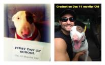 Rosco Graduated from off leash training today and we couldn't be more proud of him. He was trained in Florida by Otto Lecuona with Premier K-9 who did an excellent job! He came home two days ago so we could work with him and we brought him back today for the final "parent training" to address questions that we had and to make sure that we were following up with the correct commands. He is off leash trained and stayed with the trainer for just under a month. Today we brought him (with the trainer) to Pet Supermarket during free shots day and adoption day so the place was loaded with dogs. He did fantastic and followed his commands as he was trained with no issues. When we got back to the trainers he was taking in two pit bulls who were there for aggression issues. The trainer had us do rounds with Rosco walking past the two pits in their kennel (they went nuts of course). Rosco initially hyper focused and took a stand but was quickly redirected and walked around the distraction in a calm state over and over including the lay down command within sight of the pits. I am so impressed I can hardly contain myself. He did a great job with training! Here is a pic of Rosco with his graduation cap on, check it out! That's my boy!!