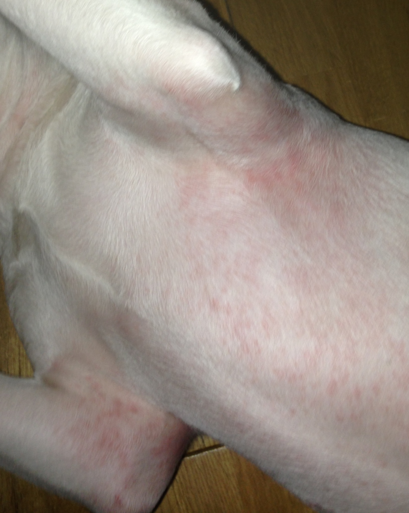 There's no question there was a cause that brought on the rash. In truth their could be a thousand different things that caused it. What I try and emphasize is the mere fact that the element that did in fact cause the problem may not have manifested to the point it is now if the immune system was strong enough to combat any form of negative effects. Skin sensitivity is often sparked by weak immune systems. Even a flea bite, laying in wet grass, or stress itself could cause a nasty rash on a dog that did not have strong immune system to fight off the common ailments that usually don't have any effect on other dogs. Bull Terriers are notorious for weak immune systems that often effect their skin (especially white ones) and most commonly with puppies from the ages of 2 months to 18 months. Yes, there are many Bull Terriers that are born with certain allergies but the problem becomes dramatically worse when the immune system isn't functioning to it's full capabilities.