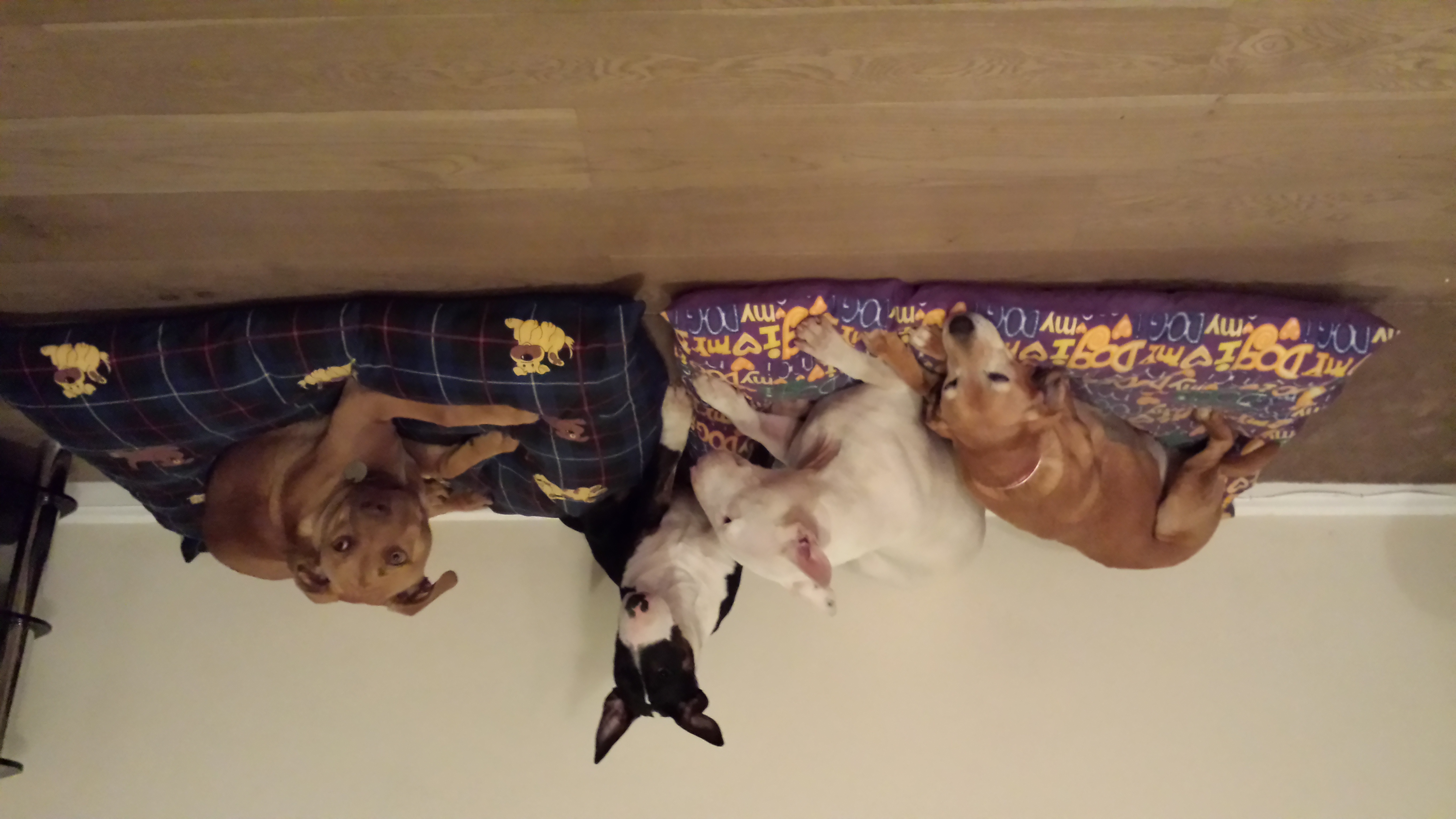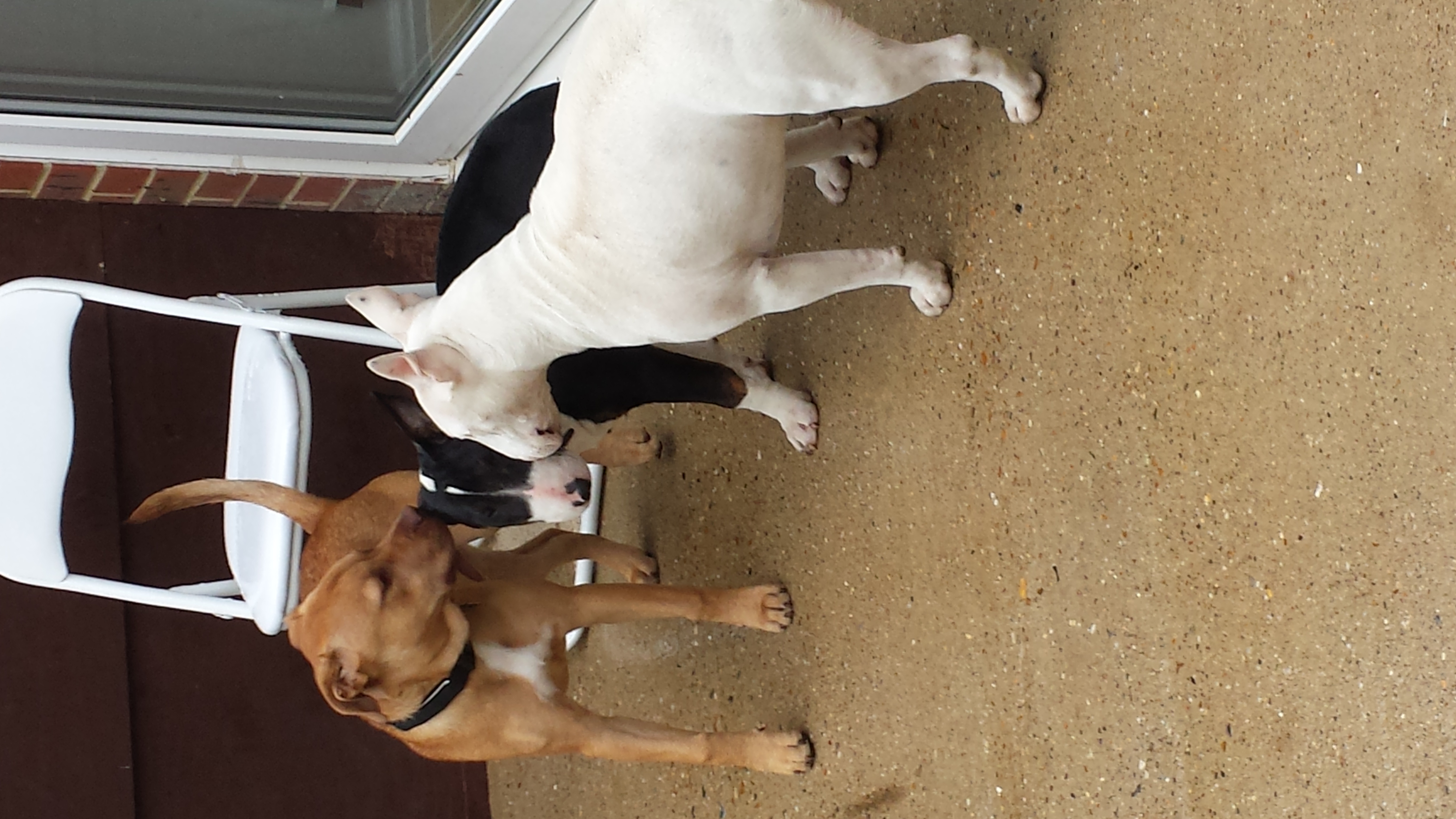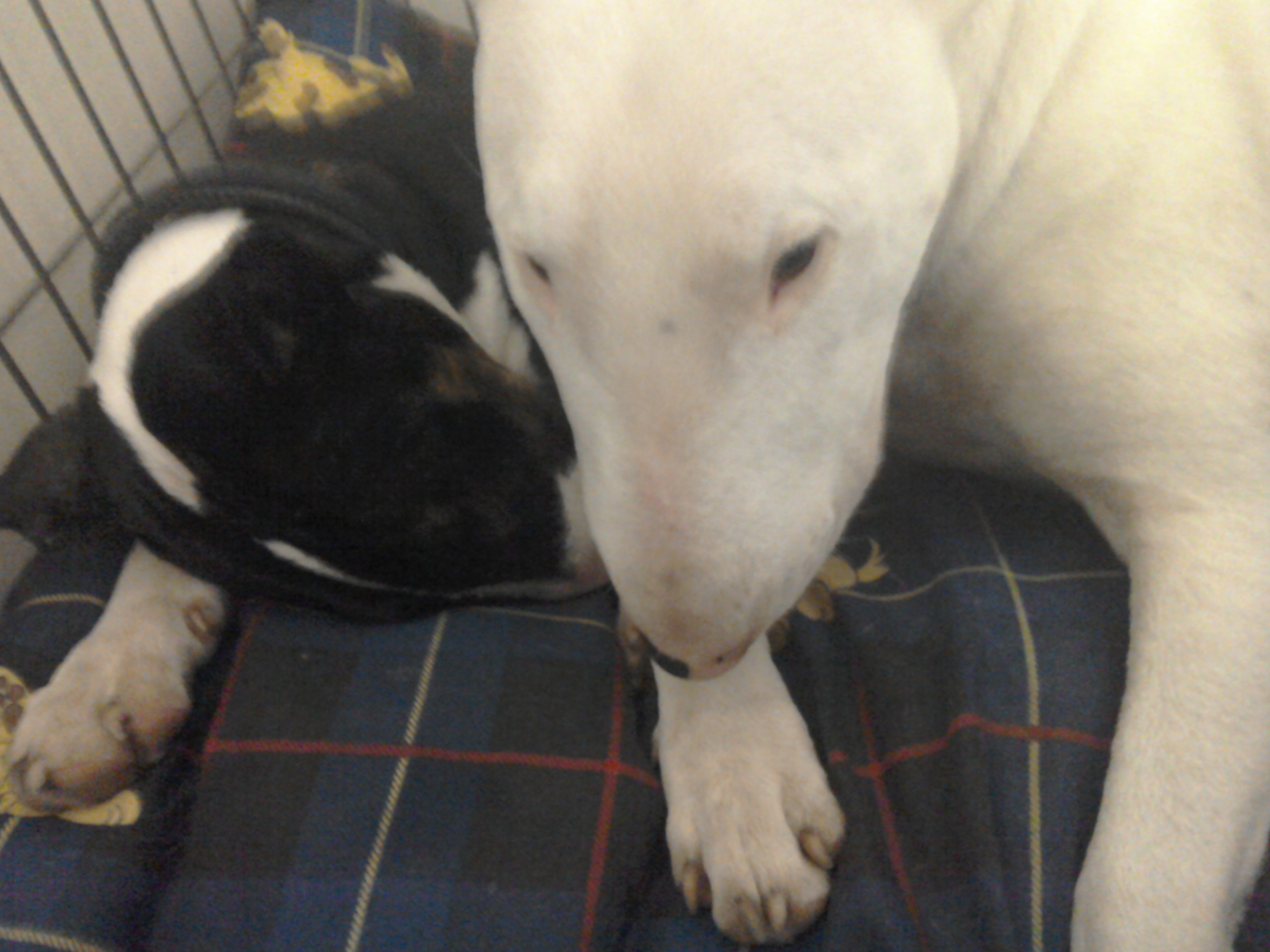 Well last night we drove over a 8 hour trip to get our new bully we got back home at 4 am this morning and now it's 6 am crazy time to go and get a dog but my partner wanted to make me happy after the upset of not being able to get the other puppy .Her name and the moment is ruby not sure if I will keep it she's 16 weeks old tri colour and is beautiful she's not had to best start 16 week old and I'm her 4th home yes I know what u r thinking but I won't write that the people I got her from had her 2 weeks and couldn't cope they had a puppy staff and said she kept starting with him and she was hyper in fact it was the staff that was hyper and his energy then set her off they said they could not cope with her she traveled very well I was is the back seat laying down and she snuggled into my face we got her home she had a pee in the garden I introduced her to the dogs one at a time which went really well but my old dog is the boss and had to check ruby a few times ruby went for a bit to much for my liking so I checked her she did it again and I bloody pinned her not something I wanted to do a hr after she came threw the door but I will not have that behaviour my dogs r all calm and we'll mannered to each other a hr it took her to give in lol stubborn minx lol so now she's in her crate fast asleep and I'm sitting here falling asleep oh as well she has heavy ears that r not up will I be able to train them with her being 16 weeks or is that to old I'll have to find the link and whst I need to get for her she's a real beauty I'll post some photos later today she's not had all injection either which I think is terrible so getting to the vets on Monday she should be well socialised by now .