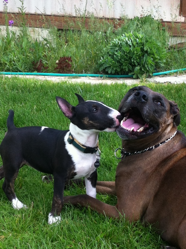 Hi, and thanks for this forum. It has been a huge help to me with my puppy, Birdie. I've had dogs including an adult bull terrier, but this is my first puppy ever. Here's Birdie with her best friend, BabyGirl.