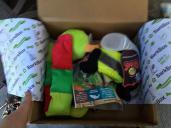 I don't know if you can see the stuff clearly in this picture, but I took this before he tore into the cardboard box. He didn't even notice anything that was inside of the box until I made the toys squeak, hahaha! The green Zogoflex Bumi is at the bottom underneath the plush toys and treats.