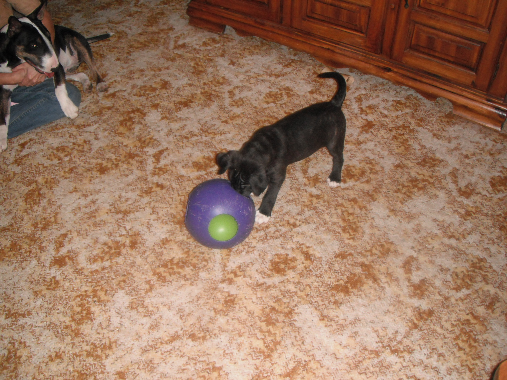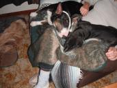 I need some input from all those with 2 or more bull terriers. Hannah is obsessed with Tea'! They get along great and Hannah just loves her to death....too much actually. I can't stop her from constantly playing with her. She doesn't leave her alone. Shes Very gentle and has never hurt Tea' at all, in fact the opposite is happening where Tea' is chewing on Hannah's face (and she lets her) and its all marked up now. Silly Hannah won't go after the puppy at all to let her know this hurts. I let them play together for short periods of time, then separate them. Once I separate them, Hannah lays at the gate or exercise pen whining for her. Tea' happily goes off playing with her toys alone. Hannah is always trying to wake Tea' from her nap by barking at her. (When was I counting down those sleeps???!!! @-) )
