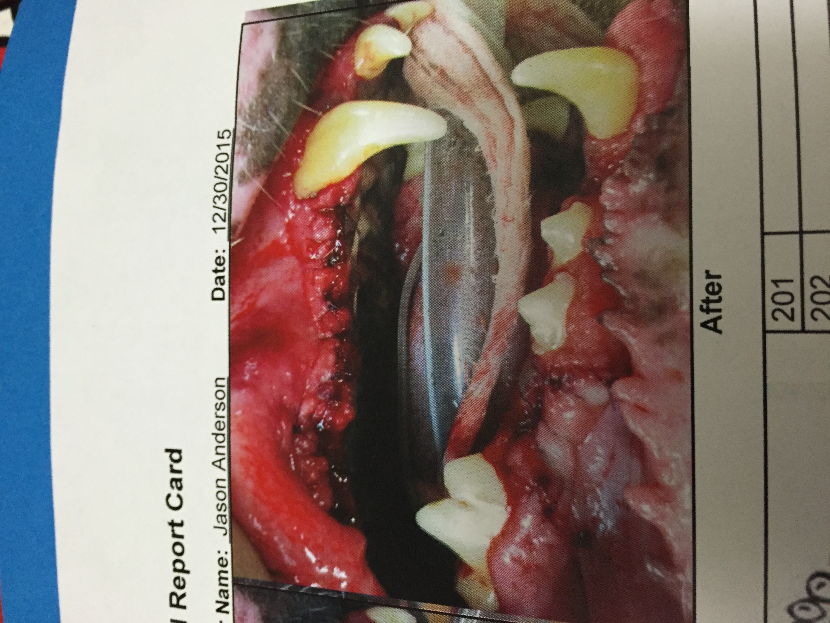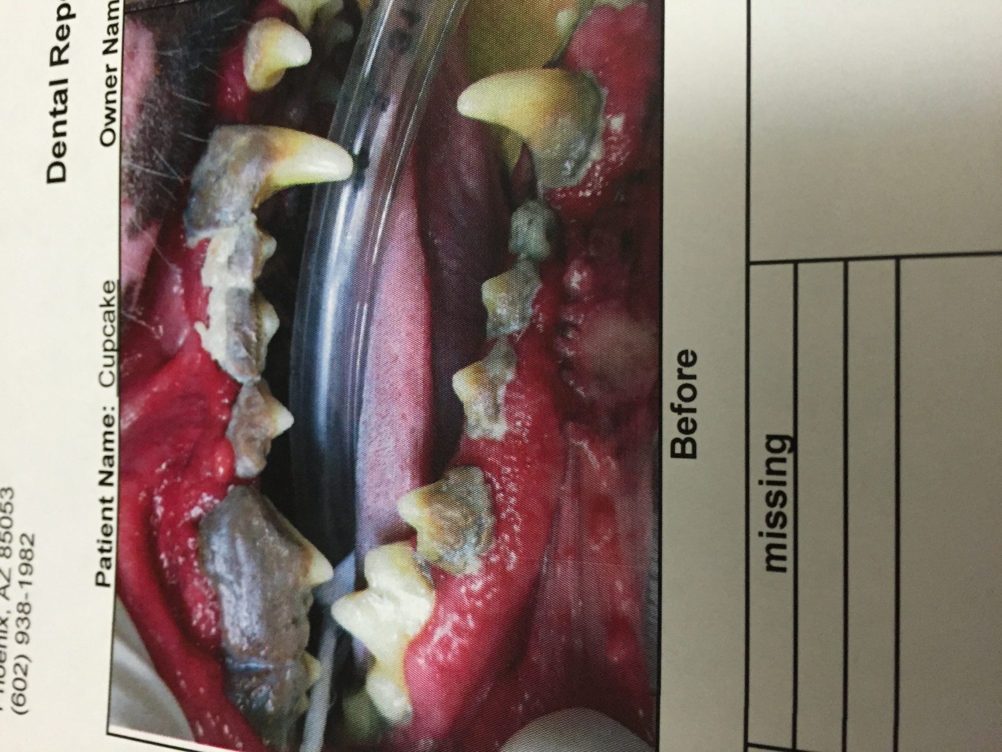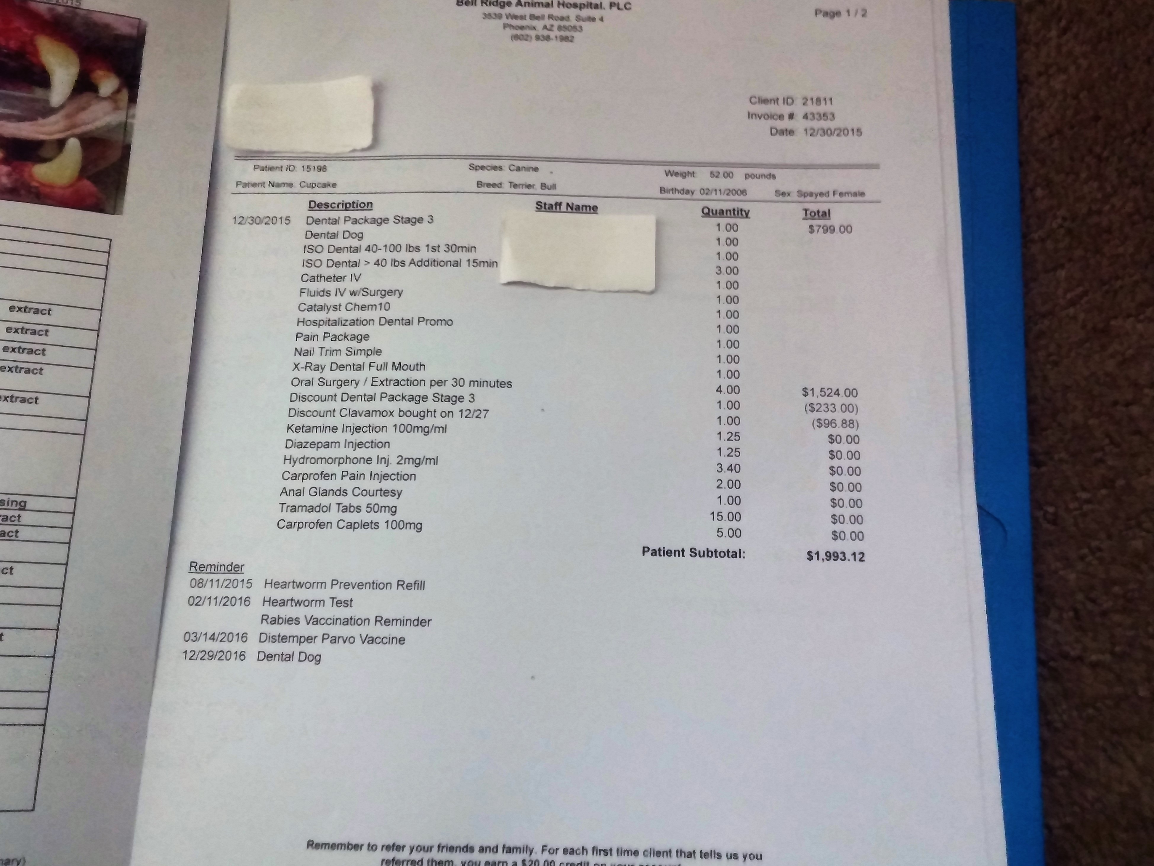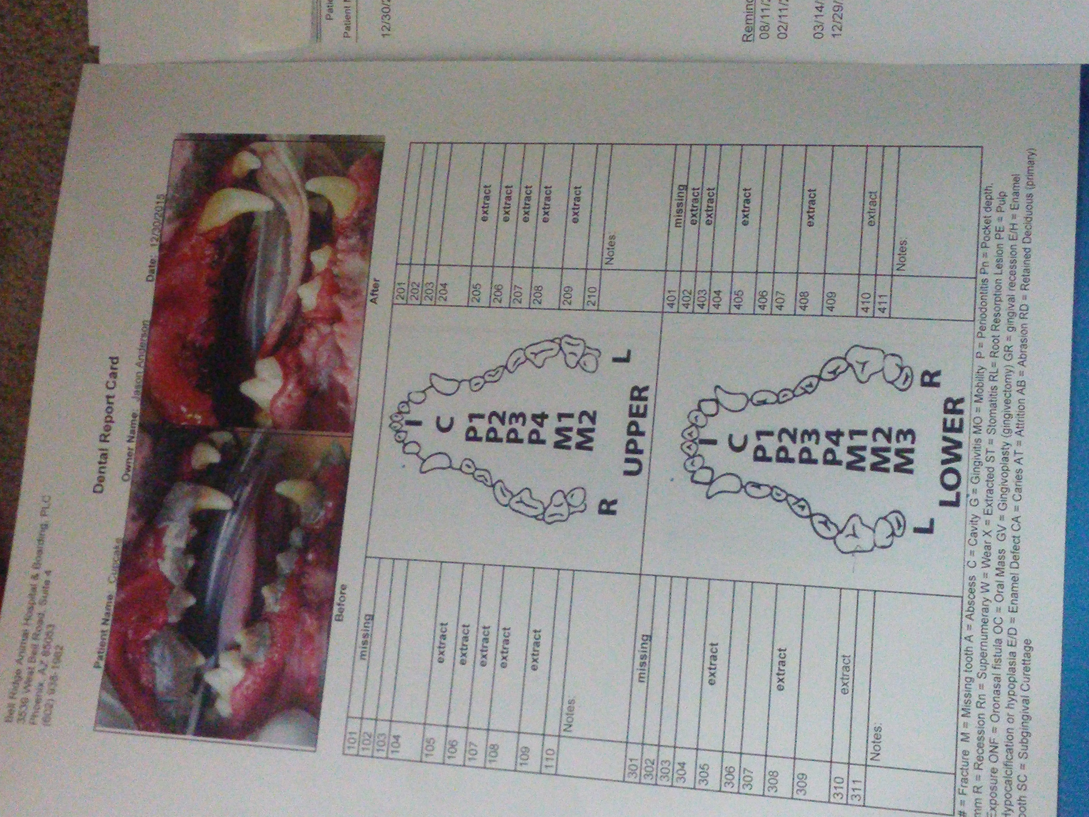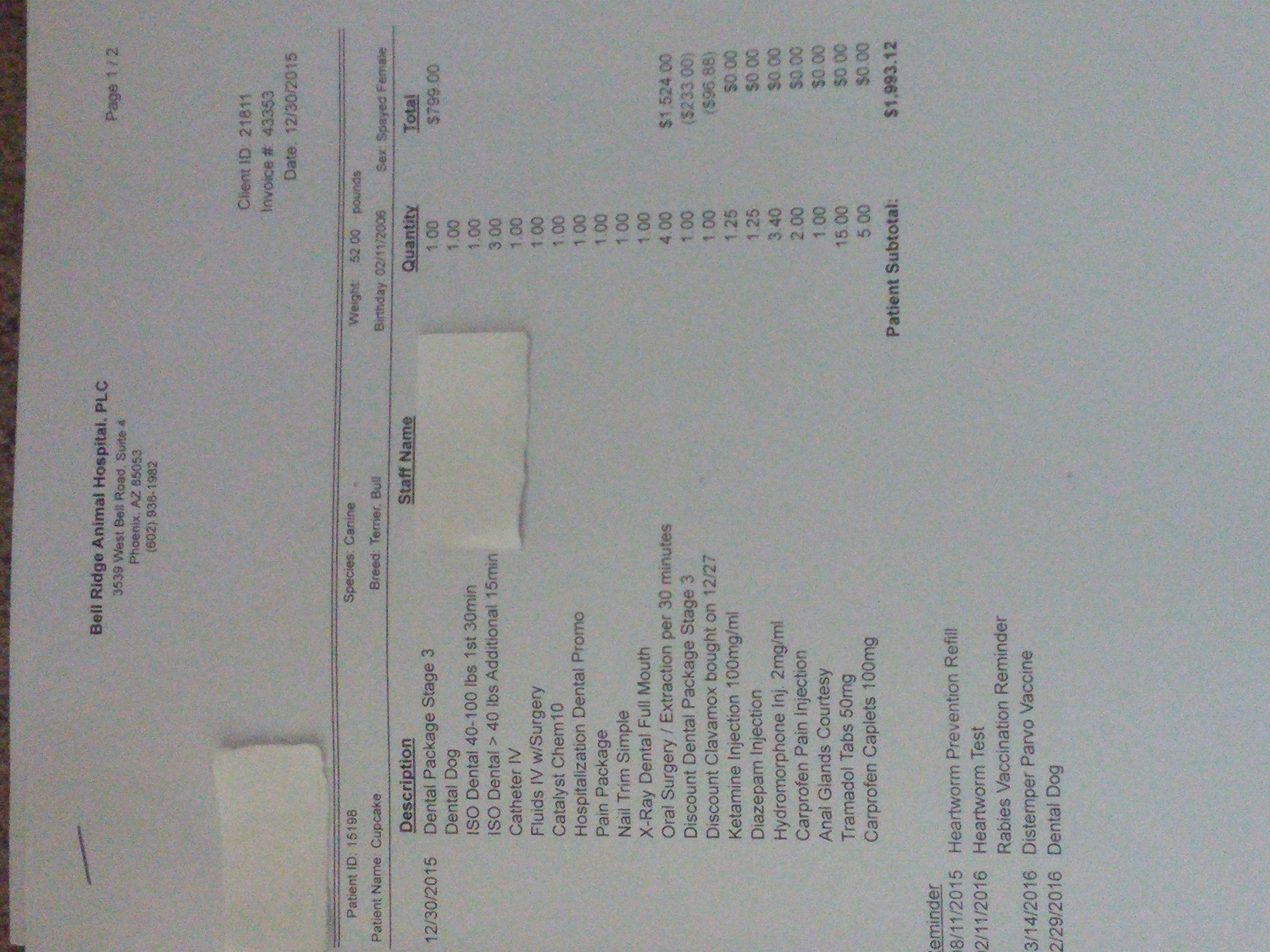 • Here is the vet bill and her teeth. In this picture you can see what teeth number was extracted and the vet names are covered up for privacy.