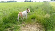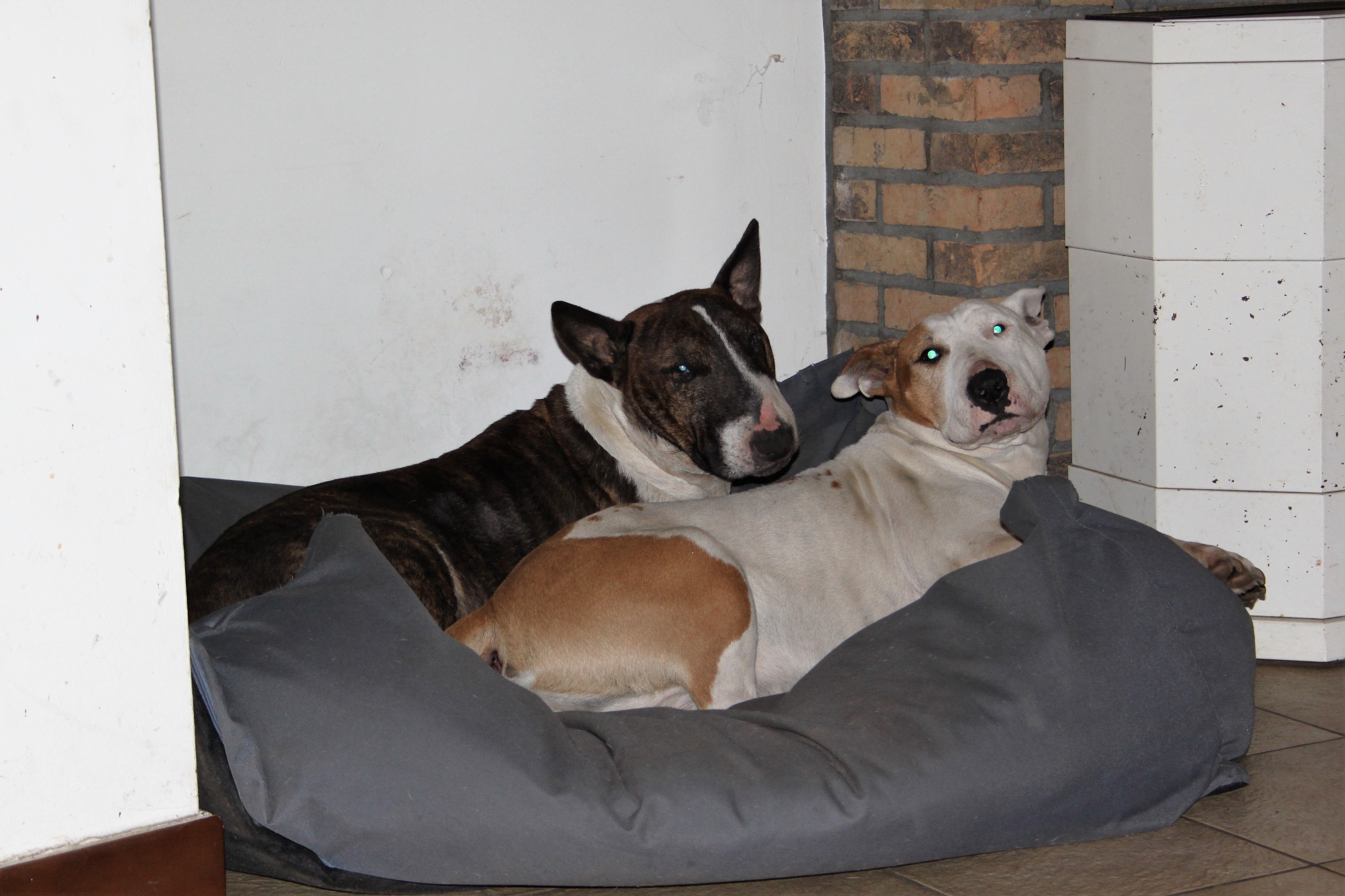 I came here to talk about Bull Terriers and share my experience with this breed, i have had 2 Bull Terriers so far and for some reason i can't stop talking about them and dogs in general!! I will admit that i also like and own other breeds but not in the way i like ebt's. I grew up with a Dobberman female, a Ca de Bou (perro de presa Mallorquin) male, and a labrador female so i grew up amongst big dogs. The moment i left home i bought my first ebt, a male named Amon. He was a brindle, dalmatien type bull terrier male. The second dog isn't a purebreed ebt but for us she is, she comes from a shelter is called Kana and she is 75% ebt and 25% american bulldog but tbh she acts like one. My male died 3 years ago but i will post some pictures of him. The female is still very much alive and kicking, even after 11 years
