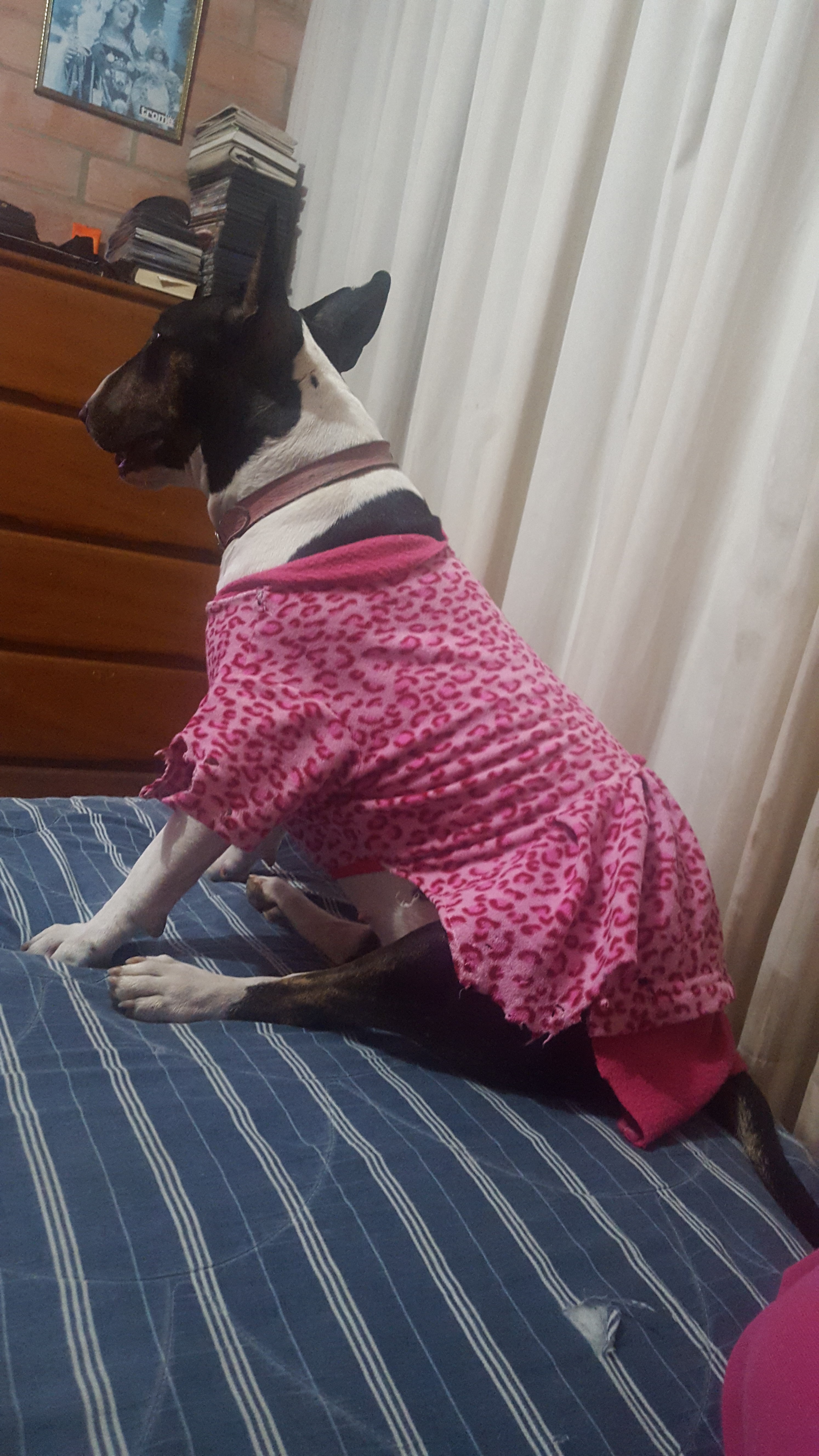 The first picture (in the room) was during her first heat cyle, the second one (in the garden) during her second heat cycle; now that I notice her neck and chest grow. After the last picture she gain some weight, i think like 3 kilos. Don't have another picture in a similar pose to compare but have a nice one in her animal print dress pajama.