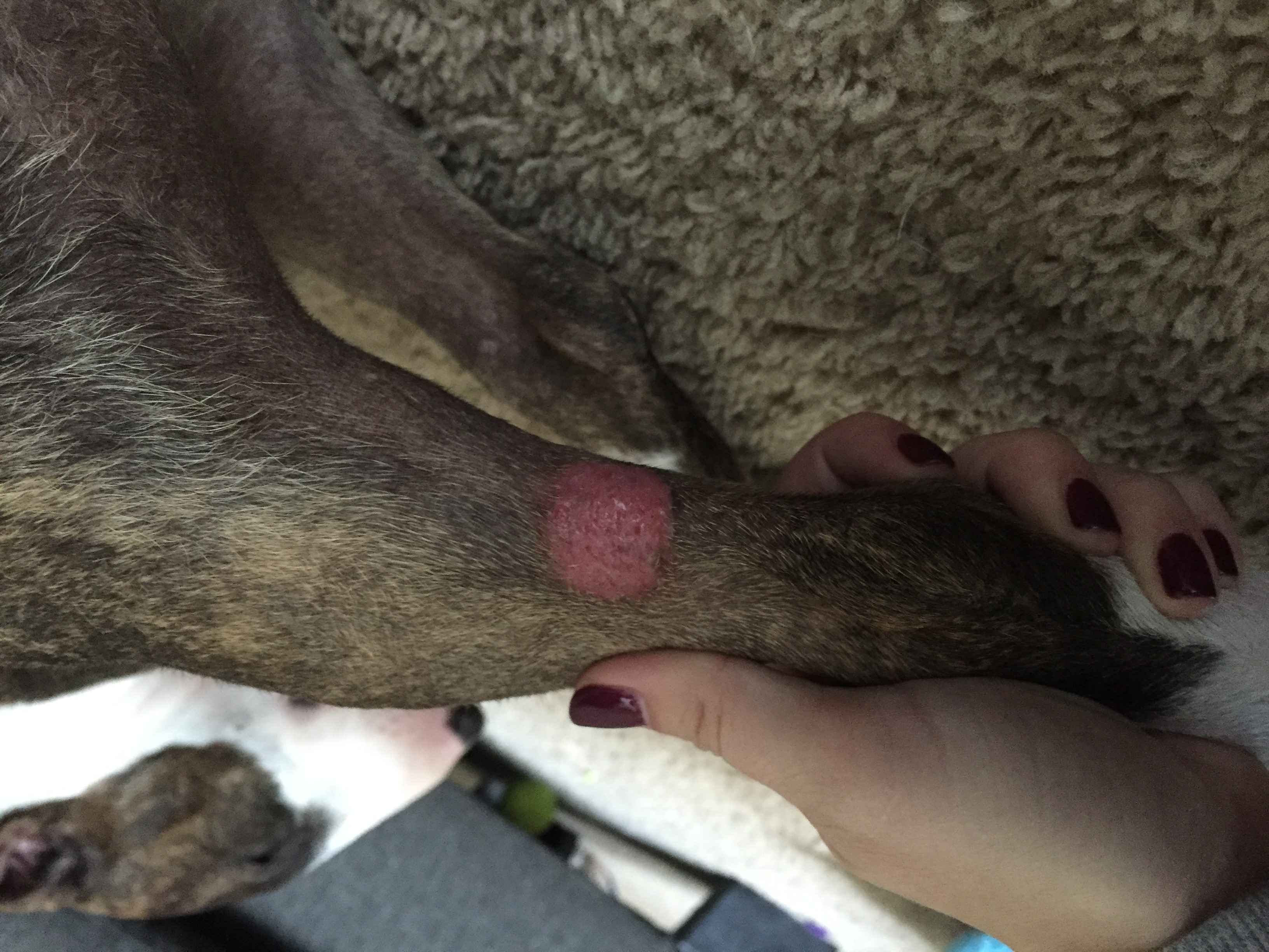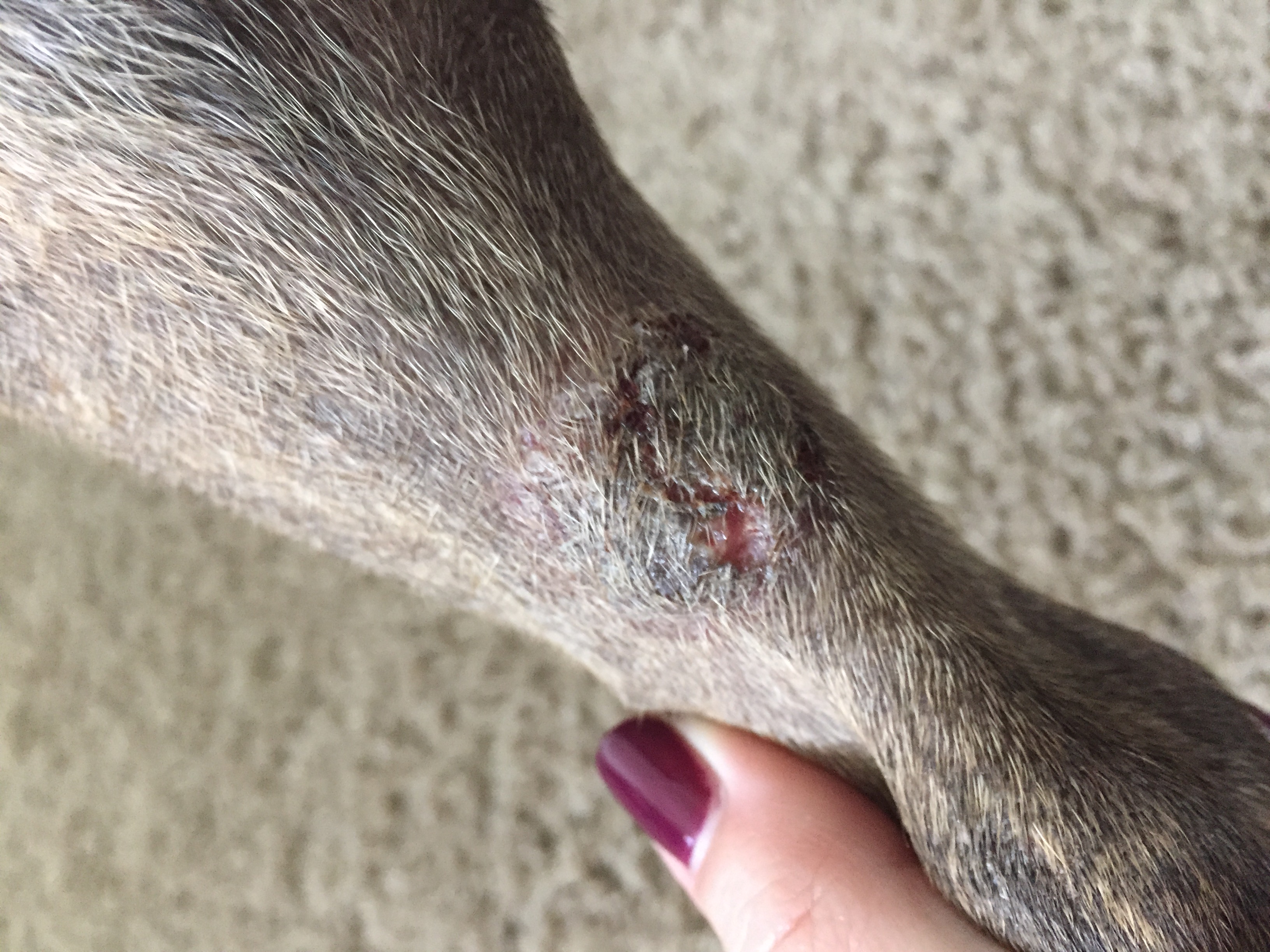 Was taking Quinn for a walk today when I noticed what I thought was a large scab on the back of her left hind leg. Squeezed it a little, felt soft, she didn't care. But when I did squeeze it it seemed like it wasn't all the way on and I could see some pink spots underneath.