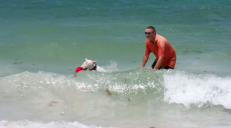 A major breakthrough for a puppy who couldn't even step in a puddle and would run away from the waves.
