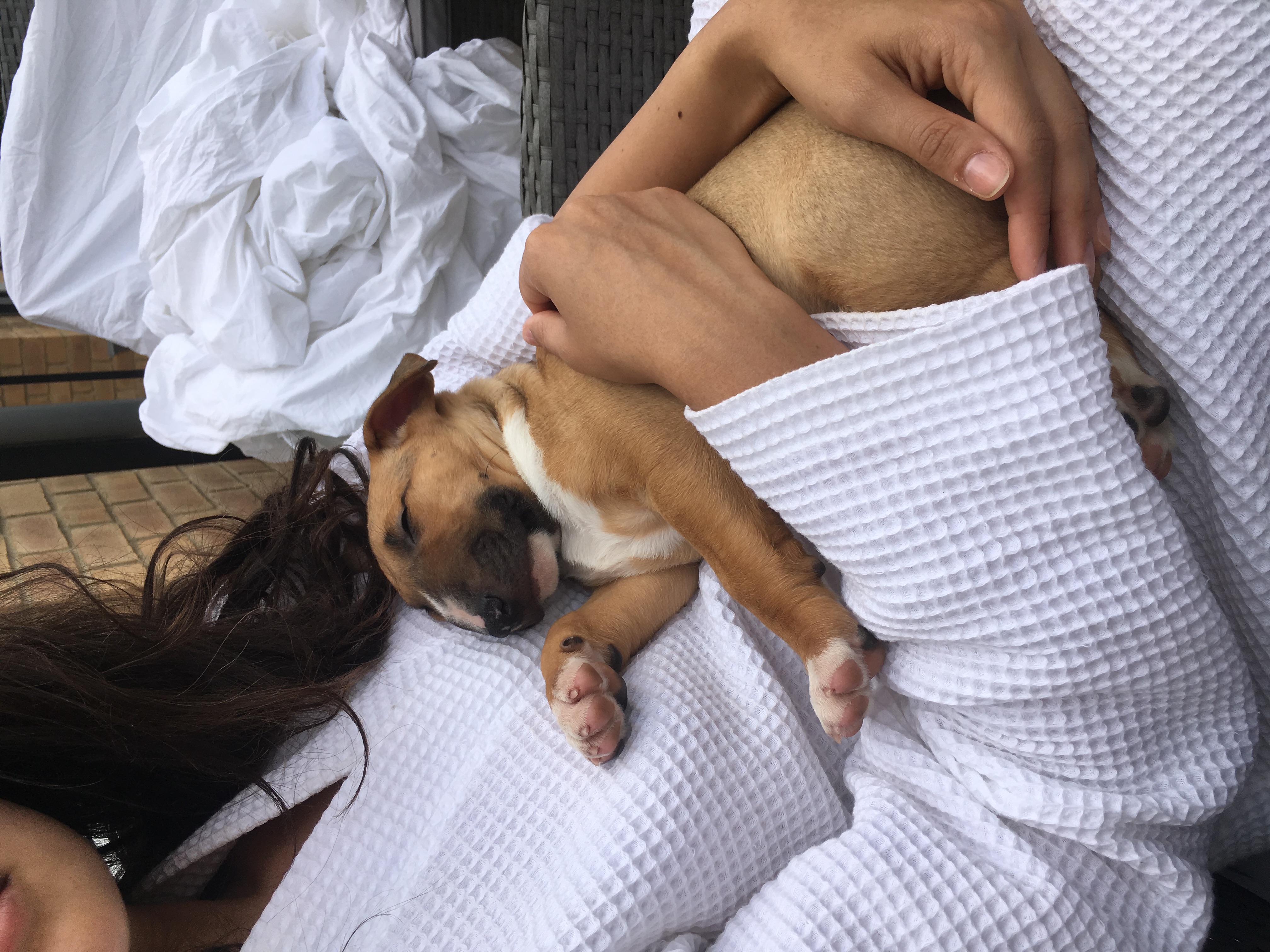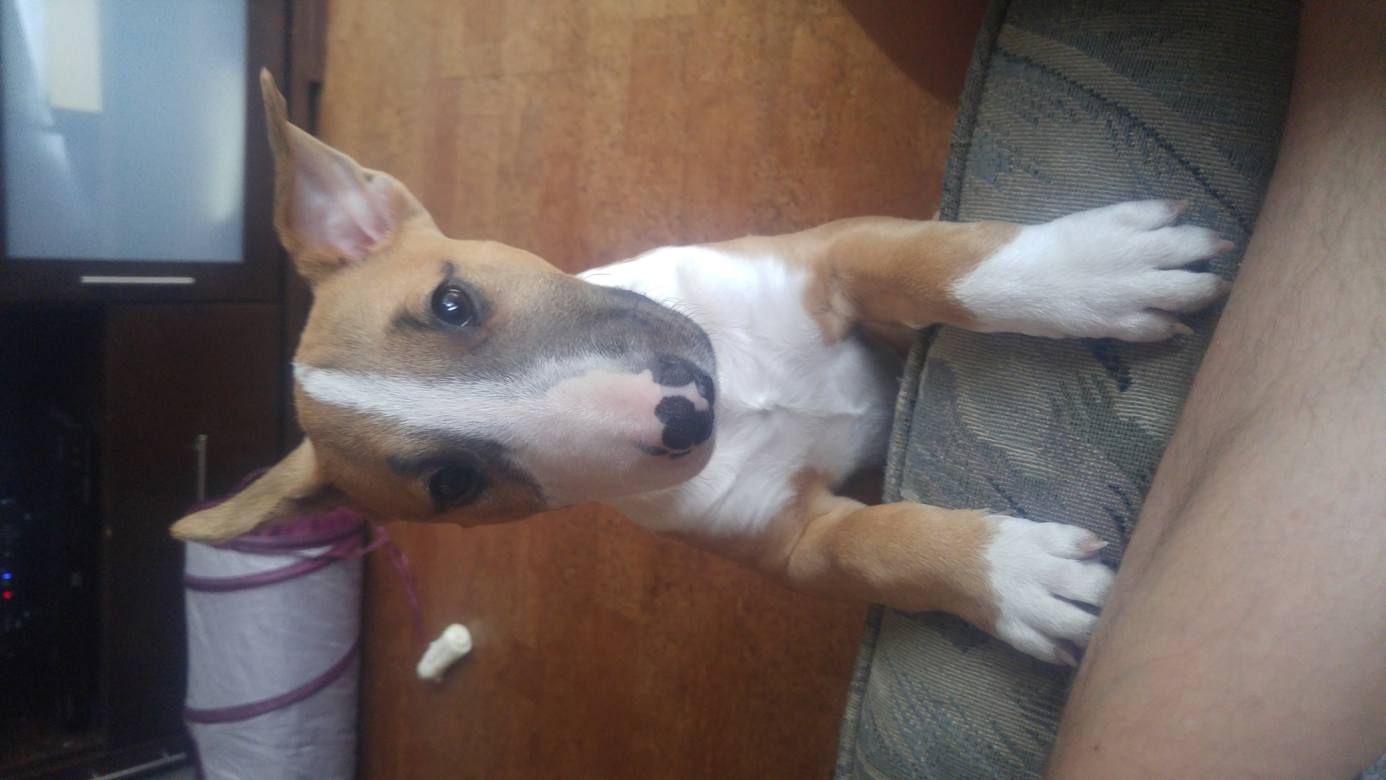 Hey guys glad to be part of this forum. I recently purchased a Bull terrier. She is almosst 12 weeks. I was wondering if you guys could help me classify her color. I know shes fawn. Haowever she has a u ique face. Half is black and half is white. Would she be considered a fawn and white or fawn smut. Tha ks for the help. Wayne