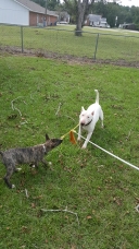 Clover may be much smaller but at least Bronte let's her think she is tough (as he sits relaxing and just holds the toy in his mouth)
