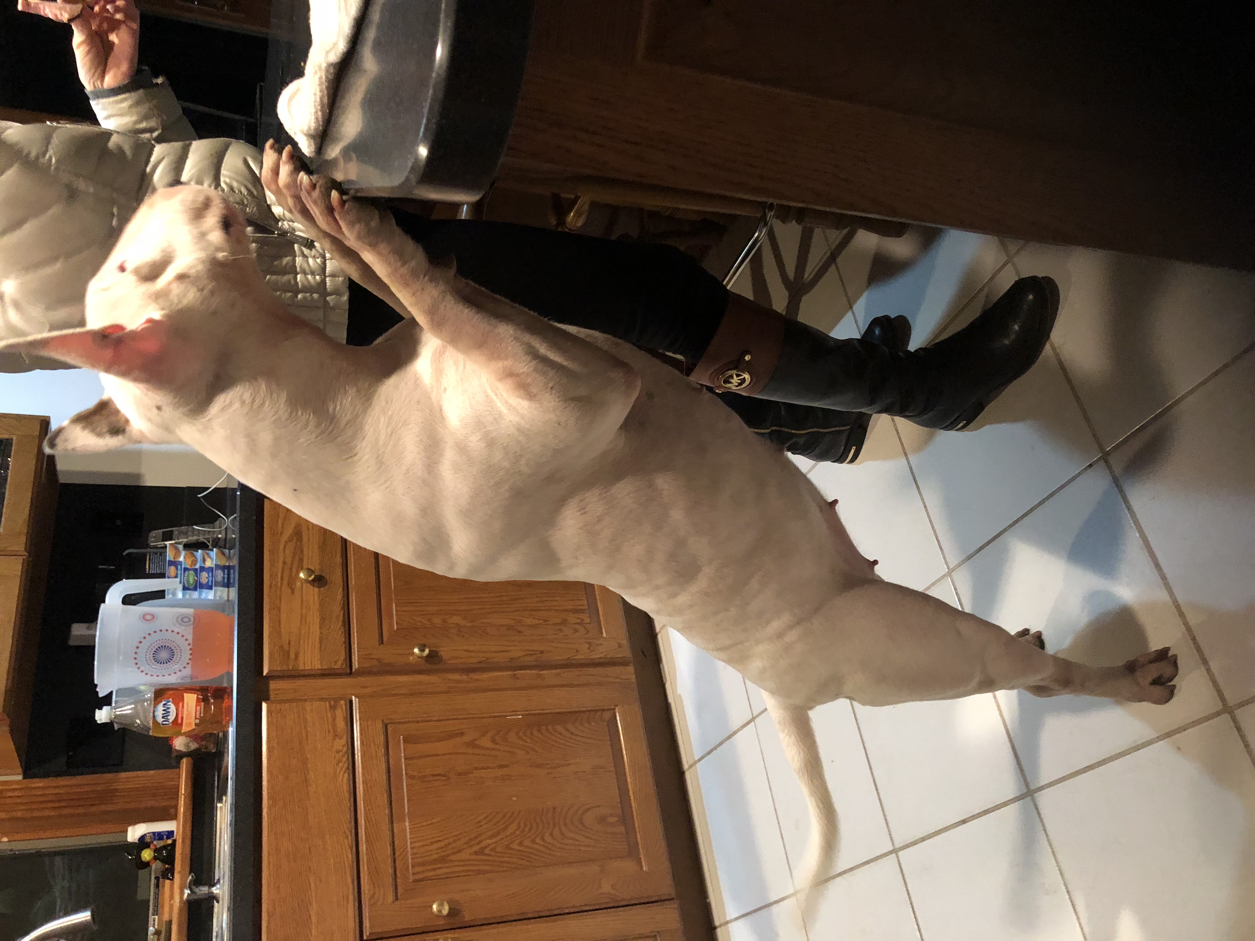 He looks awesome! He is easily 10 lbs above Mila's weight. But as I see him standing up at the kitchen counter, he must be quite a lot taller, too. If Mila tries to see what's going on "up there" she is barely able to look over the edge standing upright.