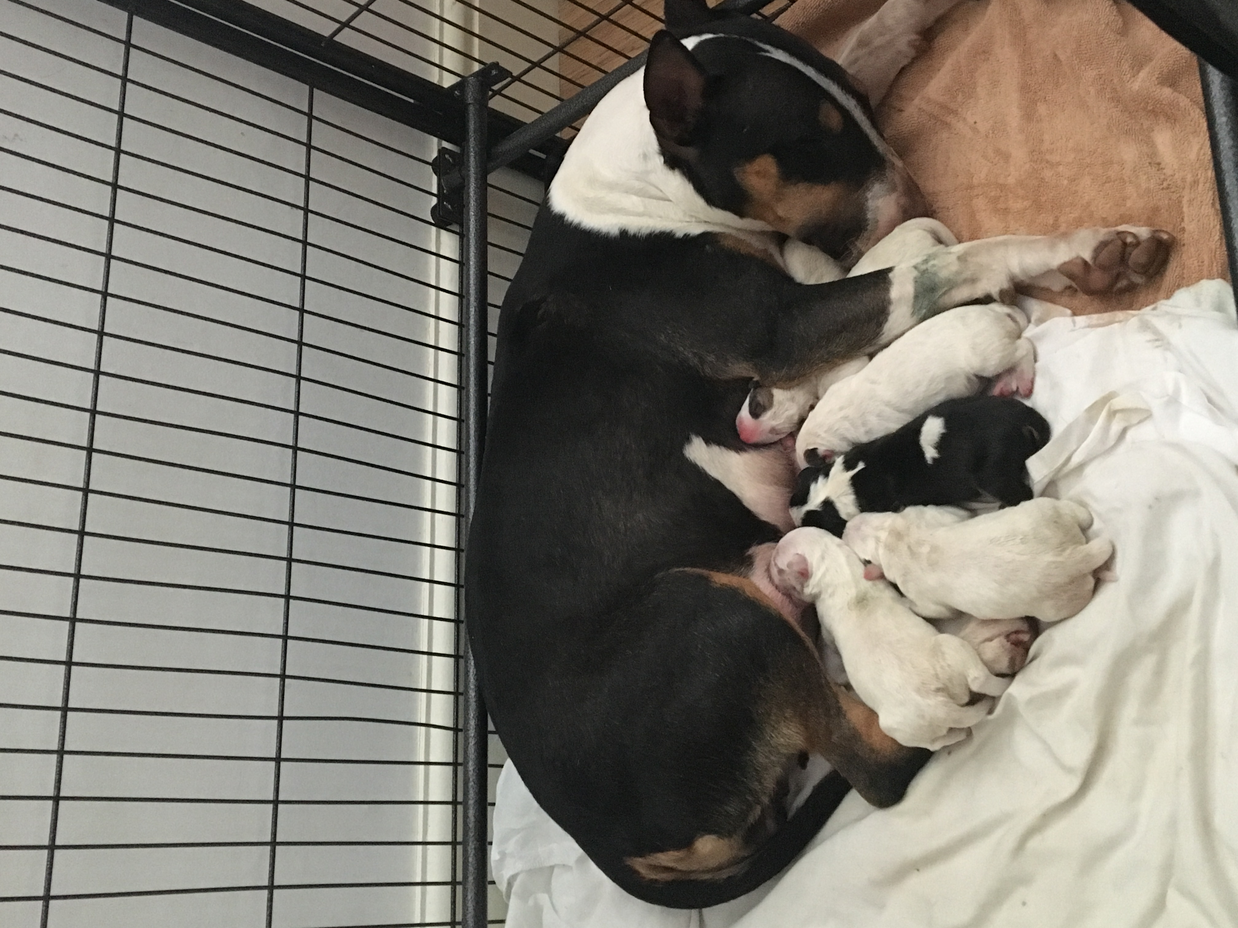 This morning at 4am Nancy gave birth 4 days early in my washing pile with her first pup! Moved her to my bedroom and she gave birth to 6 more bundles of fur over 6 hours, one boy who was extremely tiny and did not make it and six healthy girls.