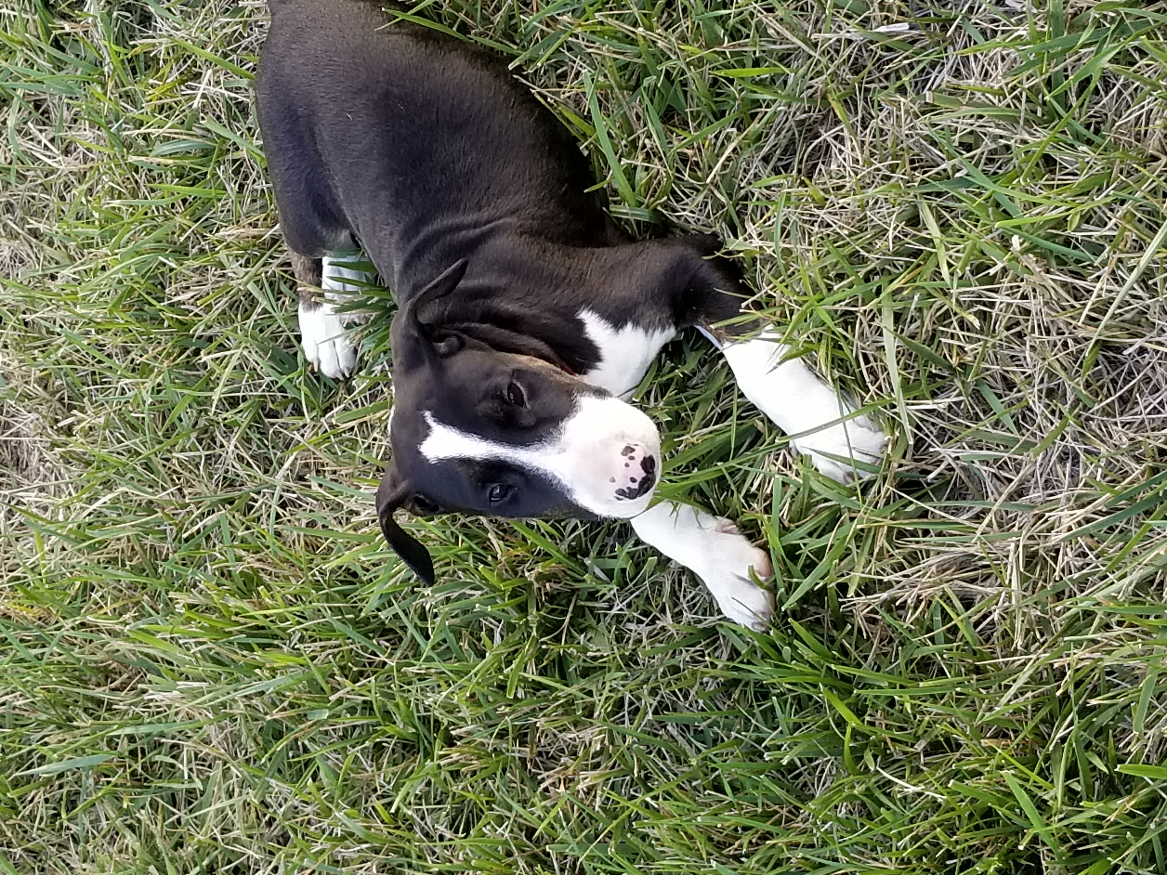 There were only two pups born. A brindle/white, and a black brindle/white. The brindle/white appeared to have a strong prey drive, he is very alert, focused and the aggressor (term used lightly, he was the bossy one LOL. He even appeared too rough for mom at times). The black brindle/white appeared to be a little more docile, food driven, and while well focused, he seemed to be distracted much easier. It was very hard to choose. If my children were a little older and I would have picked the brindle/white. While he'll need more attention and training in the beginning, he'd be an excellent dog to work (trail, scent, etc). However, knowing a more docile and "family" dog would be the best fit, I chose the "black brindle/white.