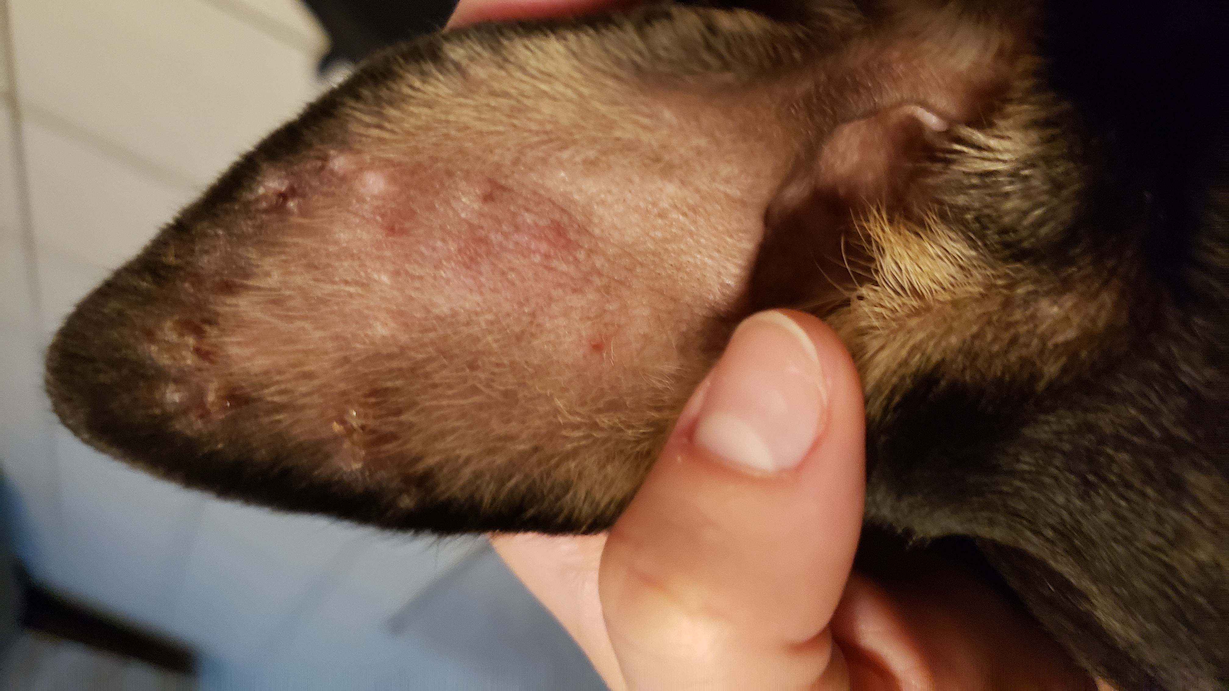 Our little Khaleesi is now 8 months old! We've noticed shes experienced allergies in the past (red eyes, little rash on her belly, sometimes itchy), but nothing like we've seen in the last few weeks! Benadryl always took care of her symptoms, but doesn't seem to help much now. Poor thing is covered in bumps (ears, face, lip, legs, bum and vagina area) and we don't if its allergies, bites, or something else. Took her to the vet this past weekend and they can't figure it out. Said it could be allergies or bites, but unsure. They did a scrape test, waiting to hear back. Gave her antibiotics in case of a secondary infection (some of the bumps she must scratch as they open and she wakes with dried blood on her ), eye drops (said her eyes seemed oozy) and this biohex mouse. She doesn't seem terribly bothered by the bumps, sometimes scratches, but otherwise acts normal. We haven't changed anything, same food/treats/shampoo/detergent. Not sure what it could be. She also just ended her first cycle, I don't know if that has anything to do with it??