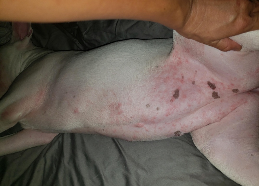 Billie's break out is slowly healing, but there's a cluster of bumps/pimples that are like knots. I've been treating the area with a antiseptic/antifungal solution and also putting a cotton bandana underneath her collar to prevent further irritation during out walks. I hope it clears up soon and she doesn't go bald in those areas!