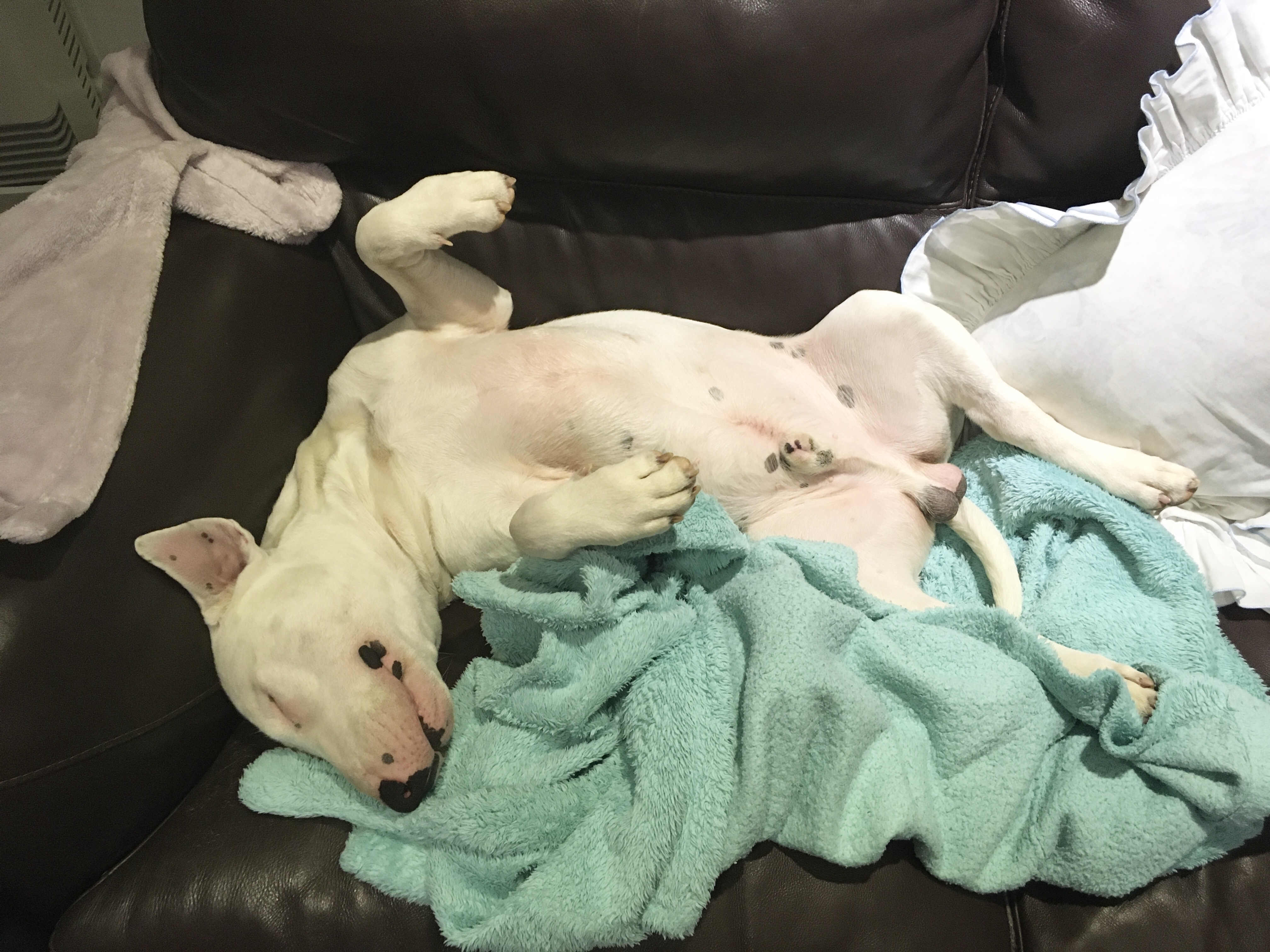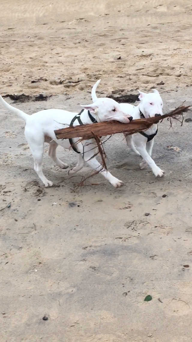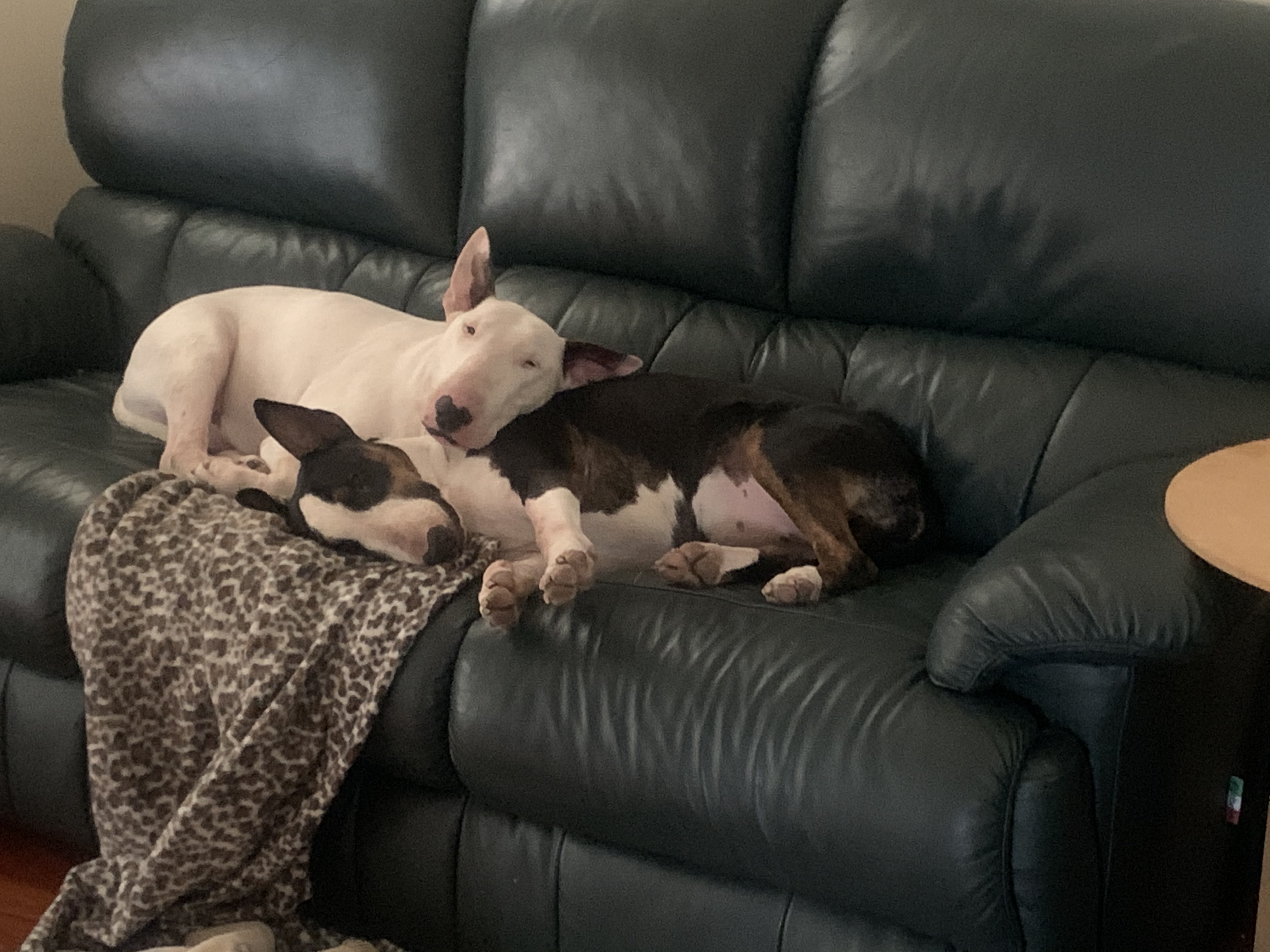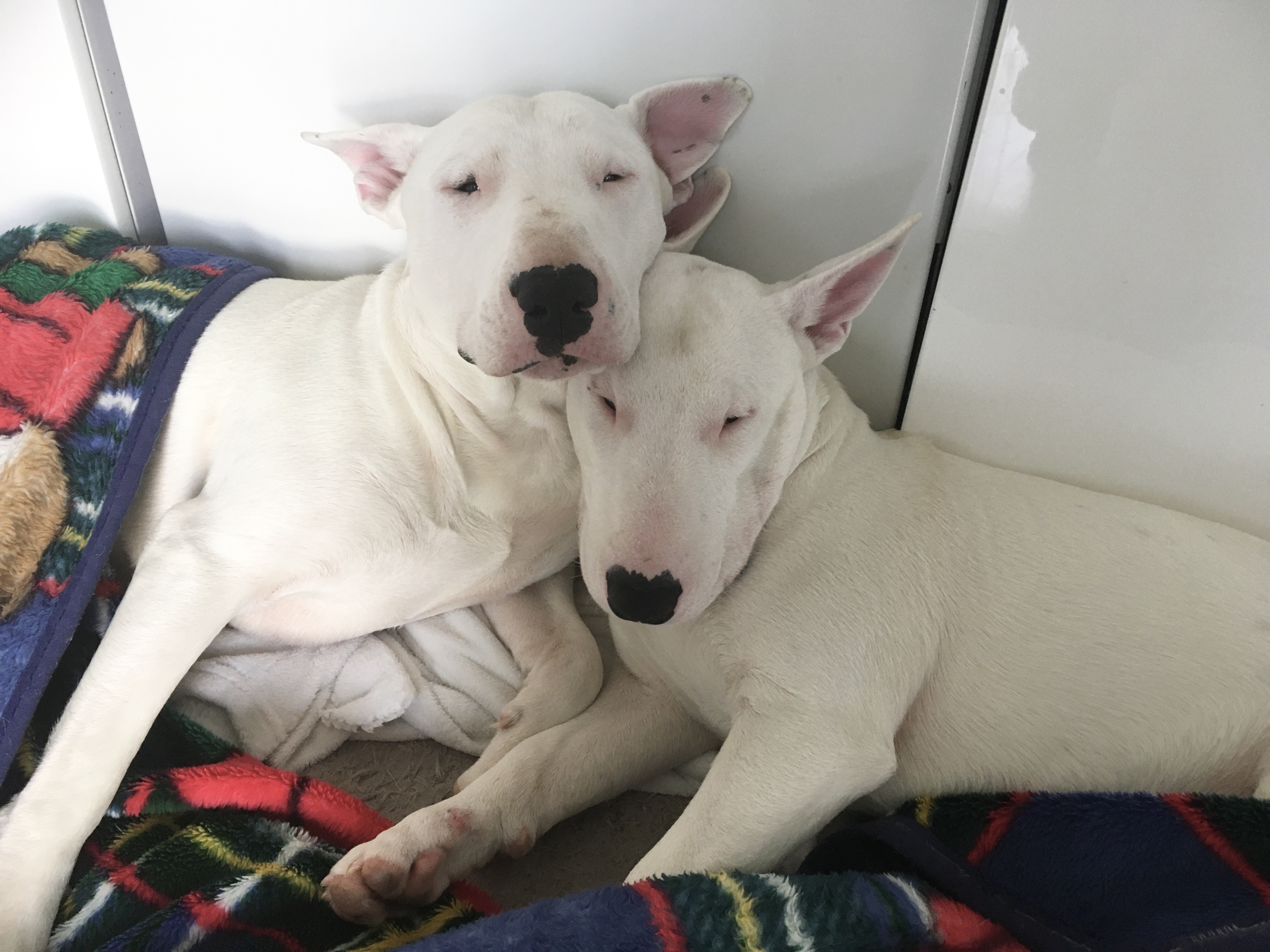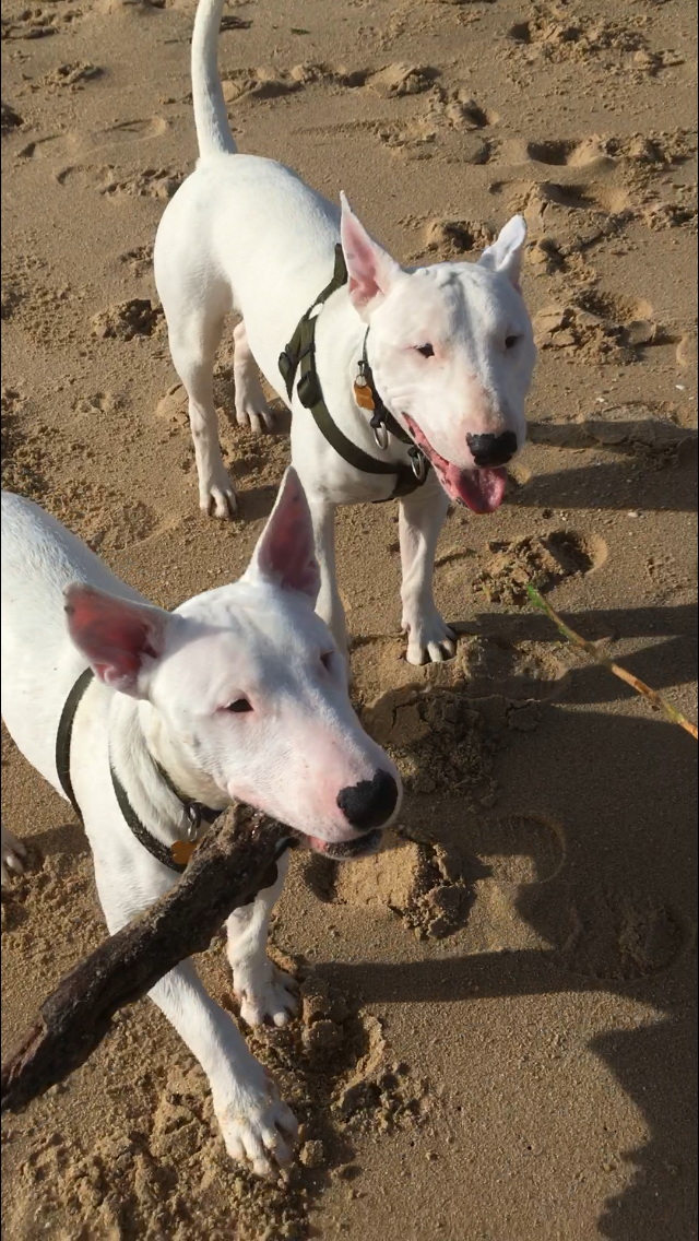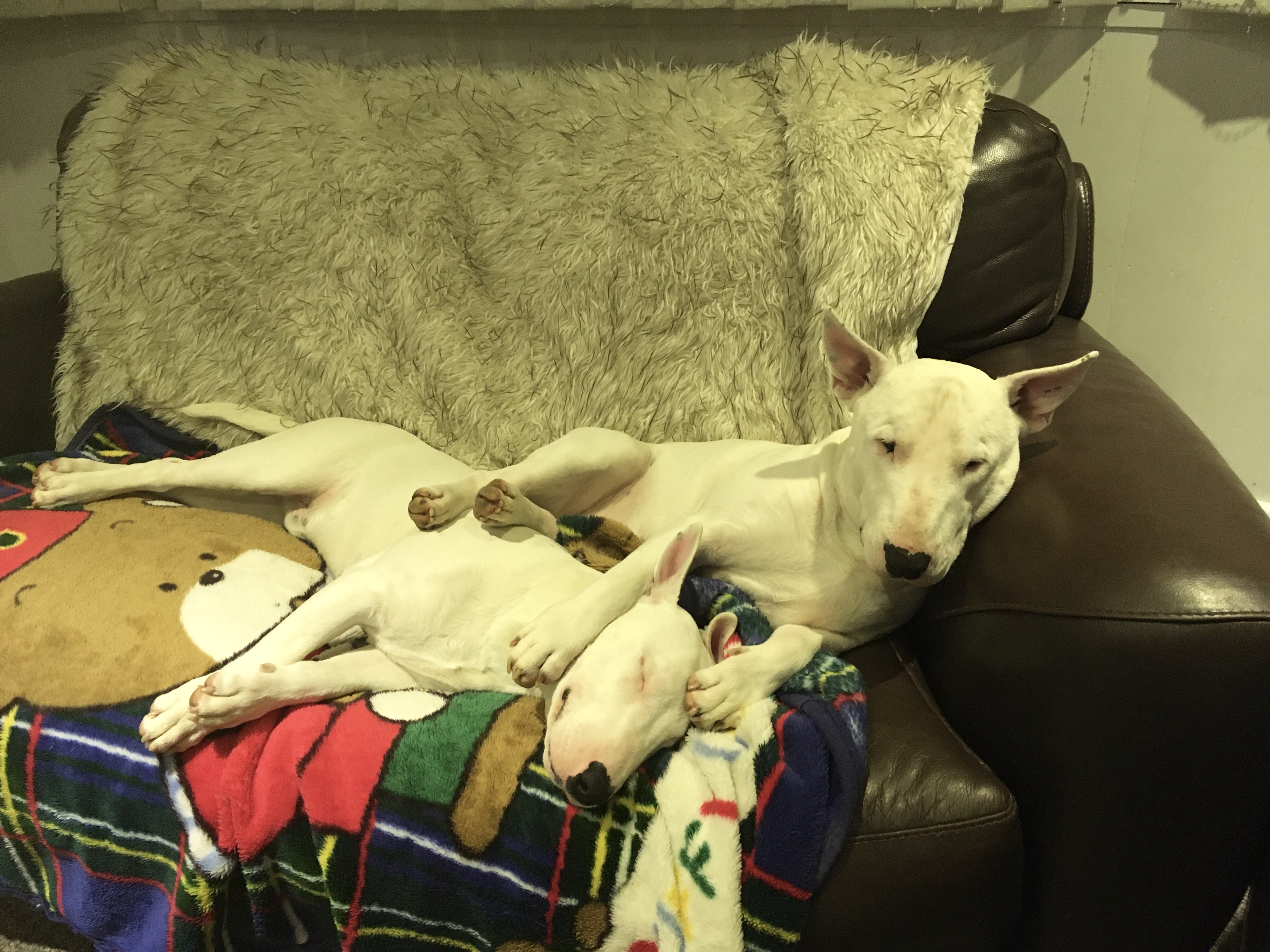 My names Rachael and I have 2 beautiful bull terriers. George, who is all white with brindle ears who’s 4, and Betty, who is Tri coloured and is 2. I’m sure like everyone on here, they are my absolute life.