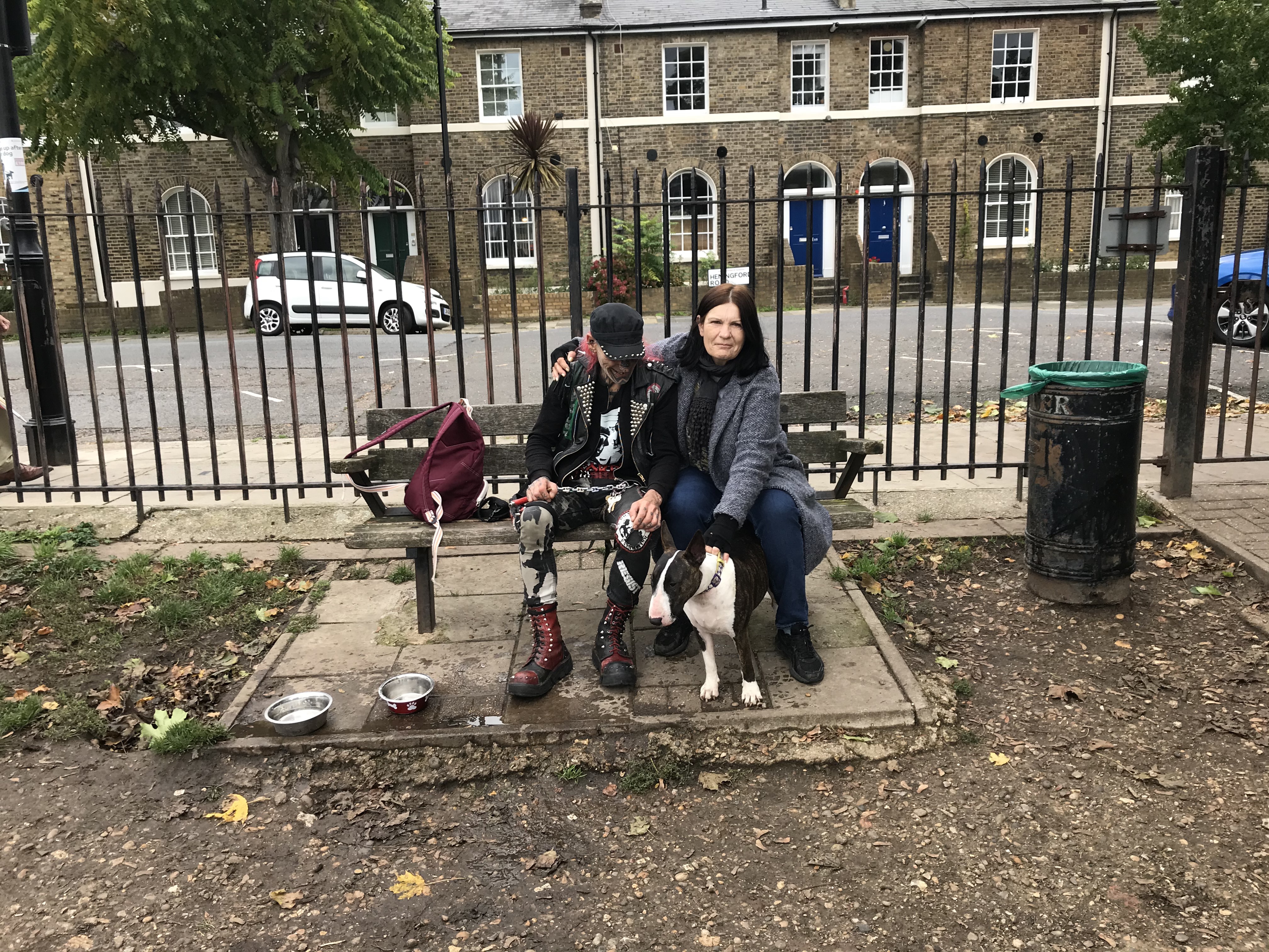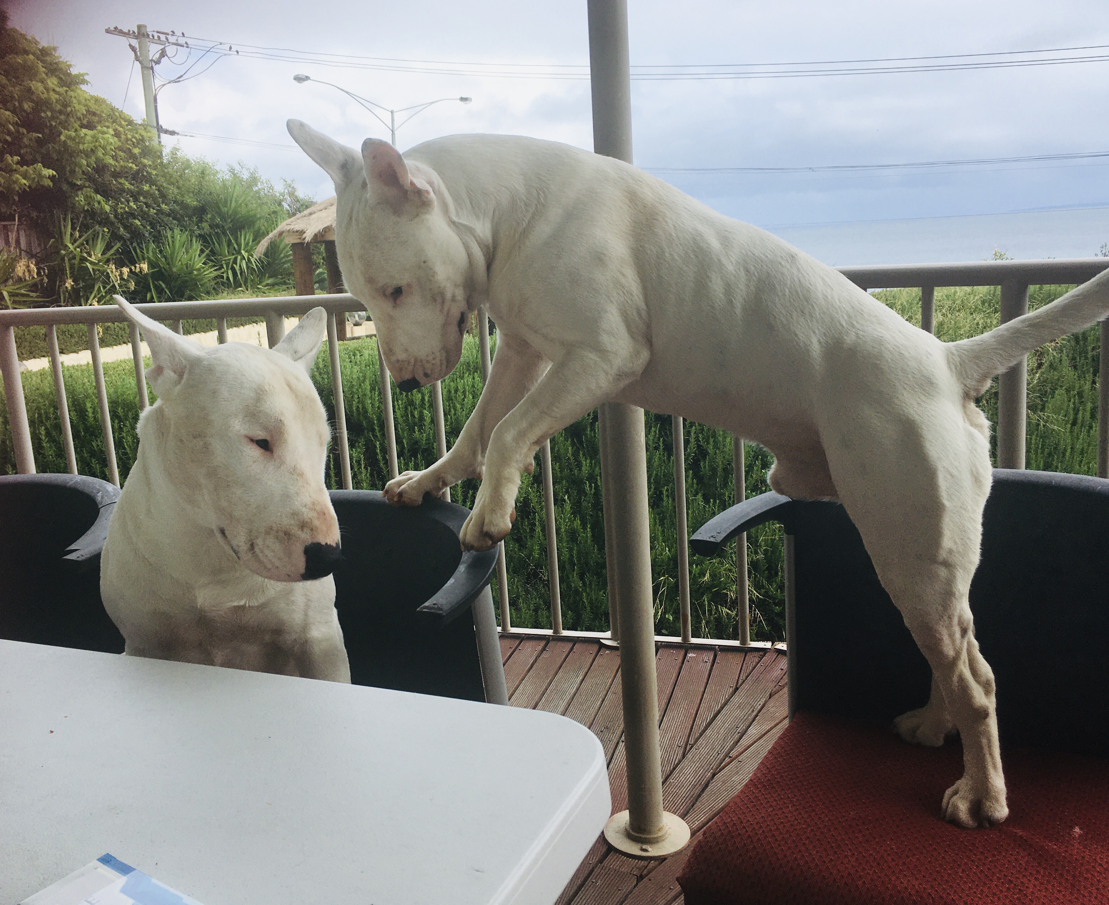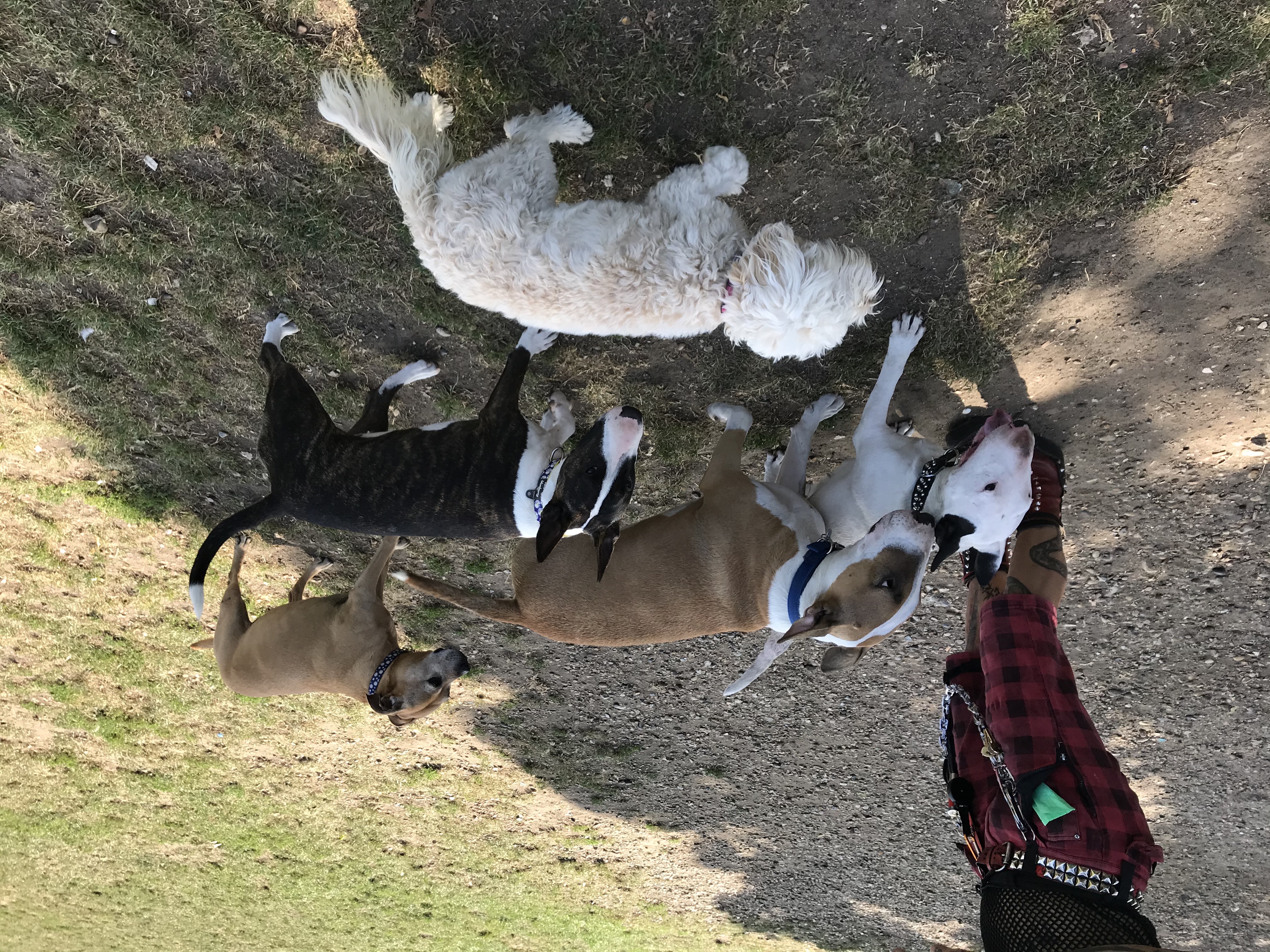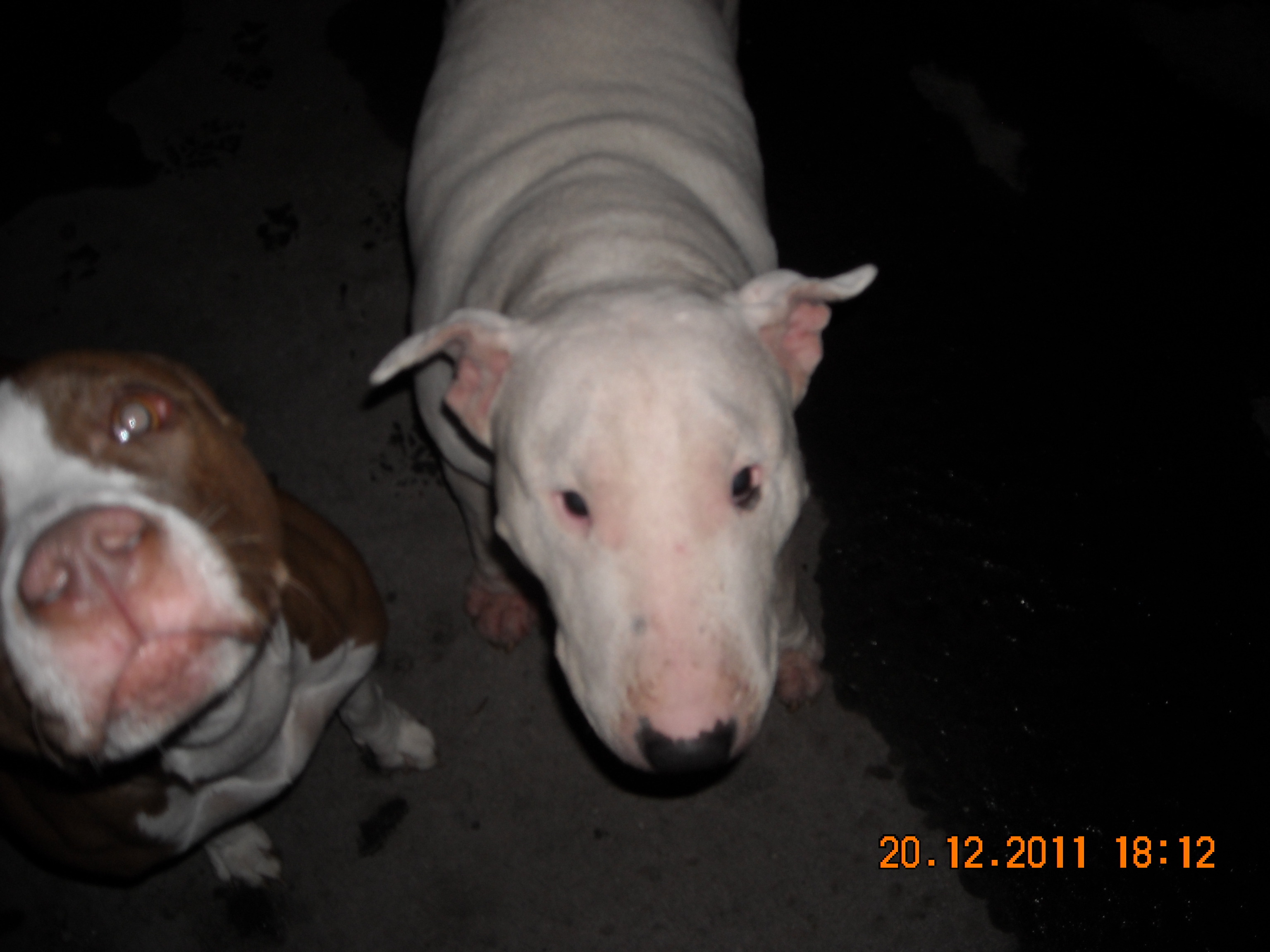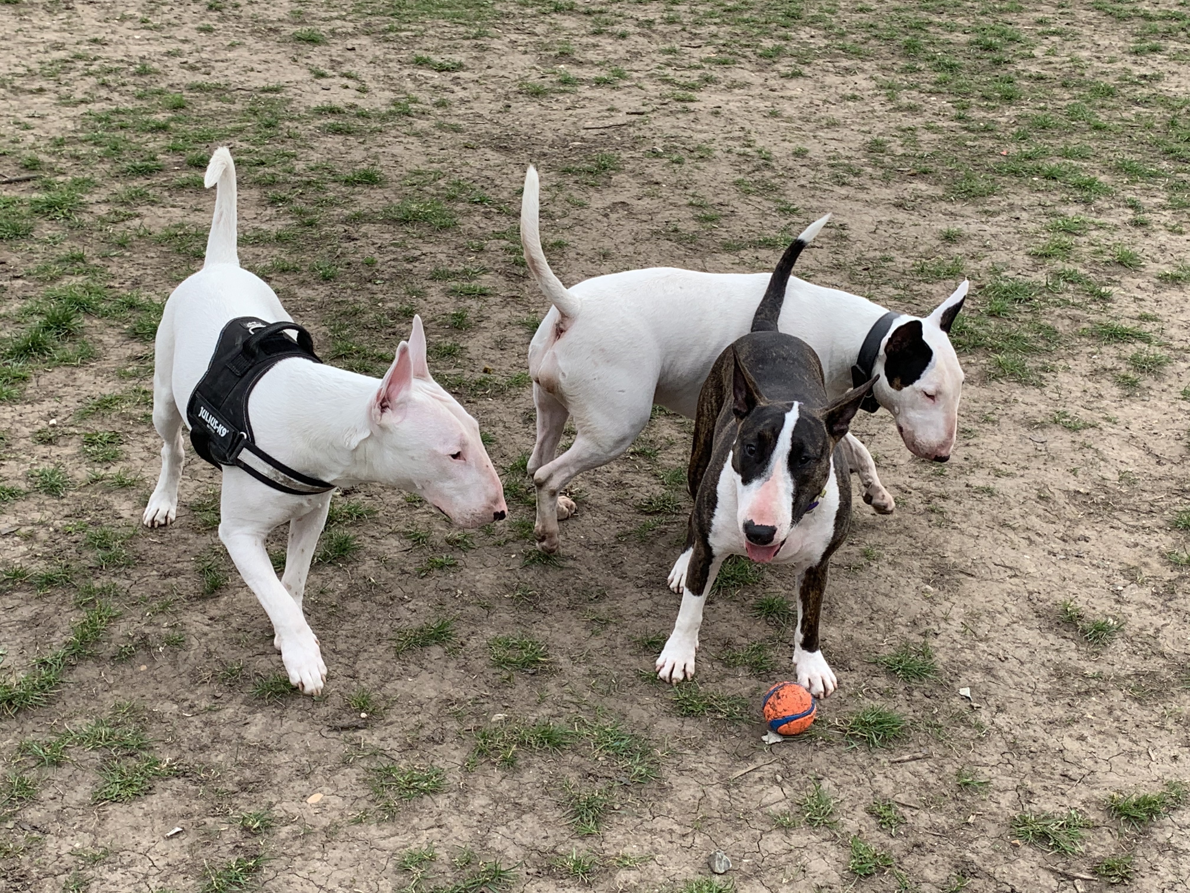 The white BT in the picture is 4 yrs old, punk rocker Stephano recued her from a back yard a year ago. She had never played with dogs before, never felt grass under her paws and she's fine and happy now!