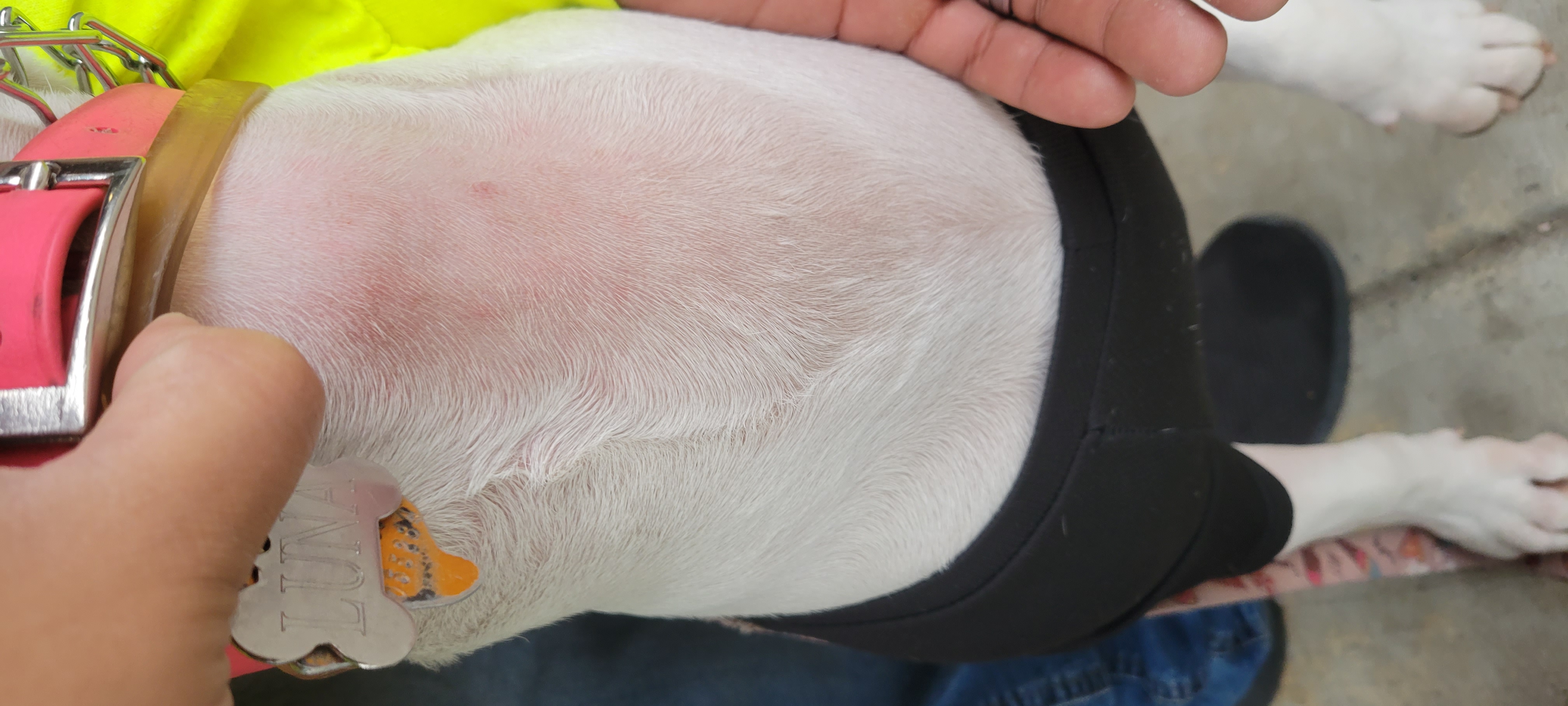 Here are some pics. She has always been like that i thought it was normal. The redness is from her training collar she is usually only pink.