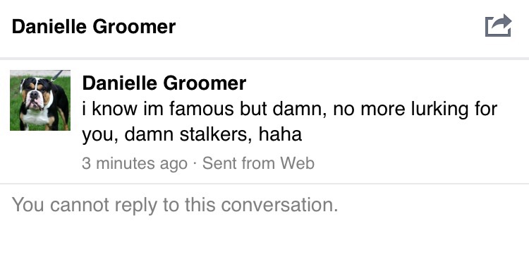 Danielle Groomer 8 hrs · Just for all my wonderful fans, again, I am NOT interested in ever being a "bull terrier breeder" again. I would rather be shit on by 1 trillion birds at once and have a crocodile make love to my leg than to own another one right now or for the next like 10 years. If I ever get another one it will be after my girls are gone from old age. No its not from any "rumors" spread about me, NO its absolutely not from lack of options, money ect. Nothing ANYONE has ever said about me via the internet has or will EVER stop me from doing what I want. I am at my dog limit at this time and will not be getting anymore, I still look forward to the future for a giant schnauzer, in due time of course. I will continue to block as many people as necessary to keep the vile, nasty, and down right negative people out of my life so I can continue on my happy existence just the way I like it surrounded by those I enjoy. It must really suck for those who hate someone so much and everything they do but yet realize they have absolutely no control or say in it. Ha ha. Living my life how I see fit, happy and with those that I love.