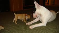 Wannabull - If you raise a Bull Terrier puppy with another breed of dog that possesses a good temperament and character you shouldn't have any problems with them growing up together and able to play with each other. I'm confident they'll become best friends. Many of the people who have purchased puppies from us over the years have brought their Bull Terrier puppy into a family that already had a dog or cat. We have yet to hear from any of them with any problems. Actually we've received several updated photos of them together playing and get along as they should.